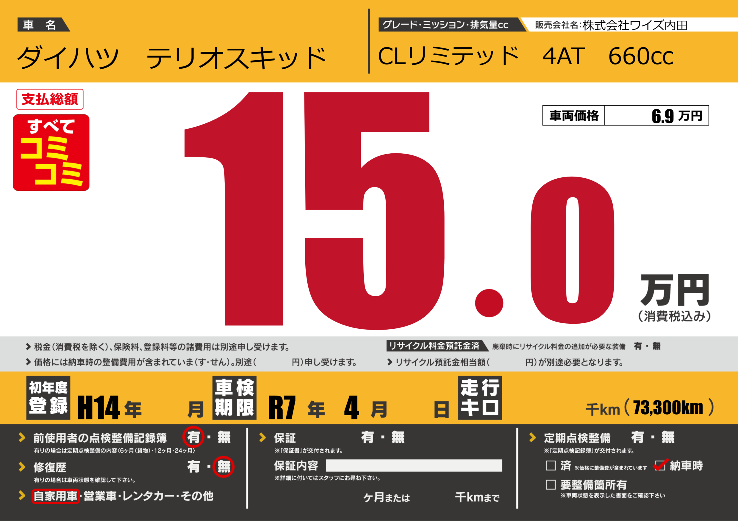 | 車名 | ダイハツ テリオスキッド | グレード ミッション 排気量 |