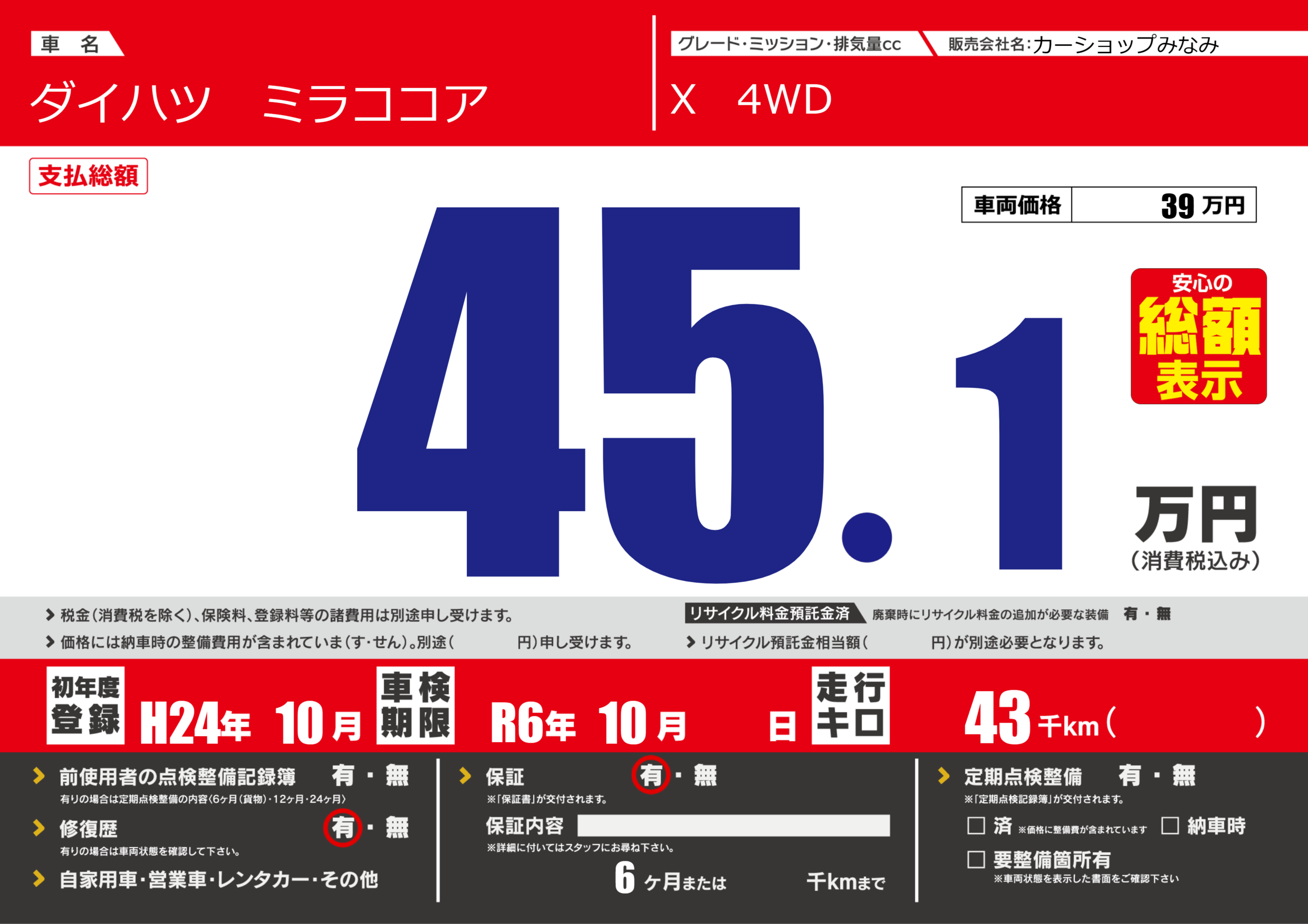 | 車検制限 | R6年 10月 - 日 | ||