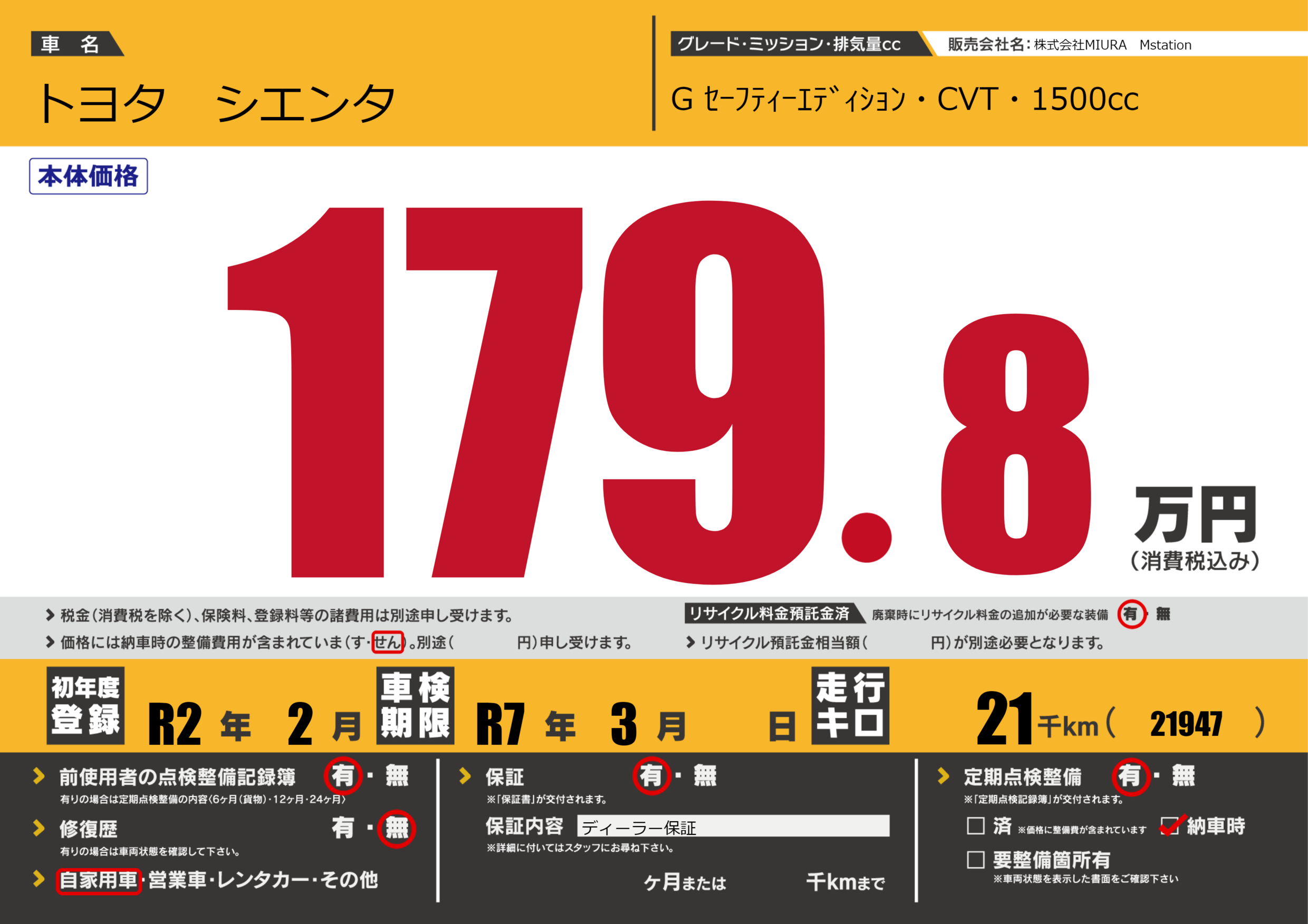 | 車名 | トヨタ シエンタ | グレード ミッション 排気量 |