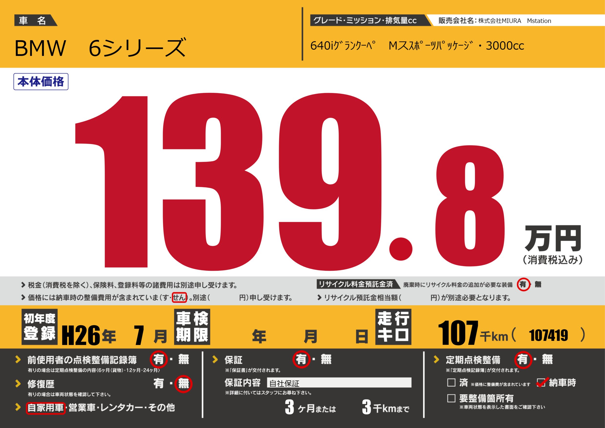| 車名 | BMW 6シリーズ | グレード ミッション 排気量 |