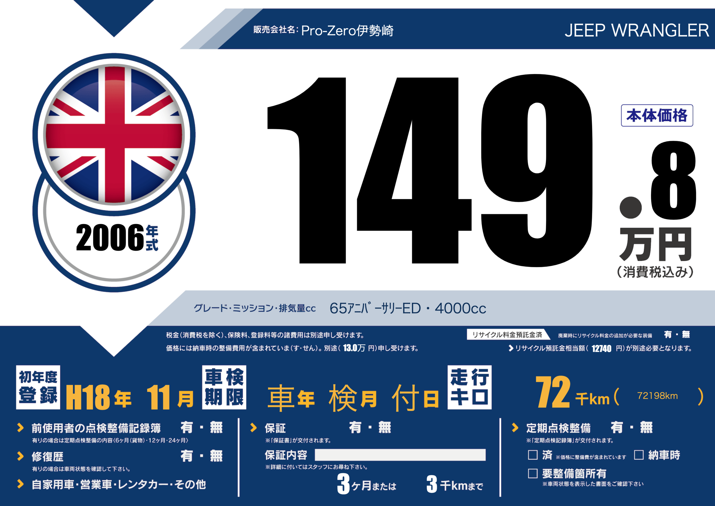 | 車名 | JEEP WRANGLER | グレード ミッション 排気量 |