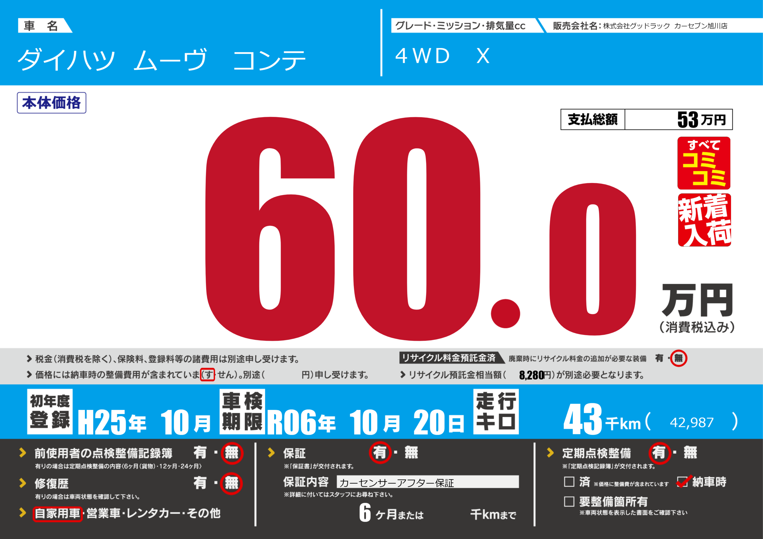 | 車名 | ダイハツ ムーヴ コンテ | グレード ミッション 排気量 |