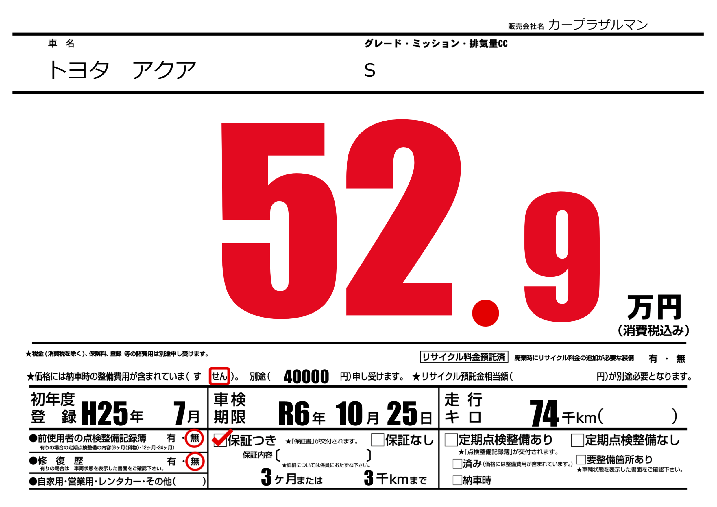 | 車名 | トヨタ アクア | グレード ミッション 排気量 |