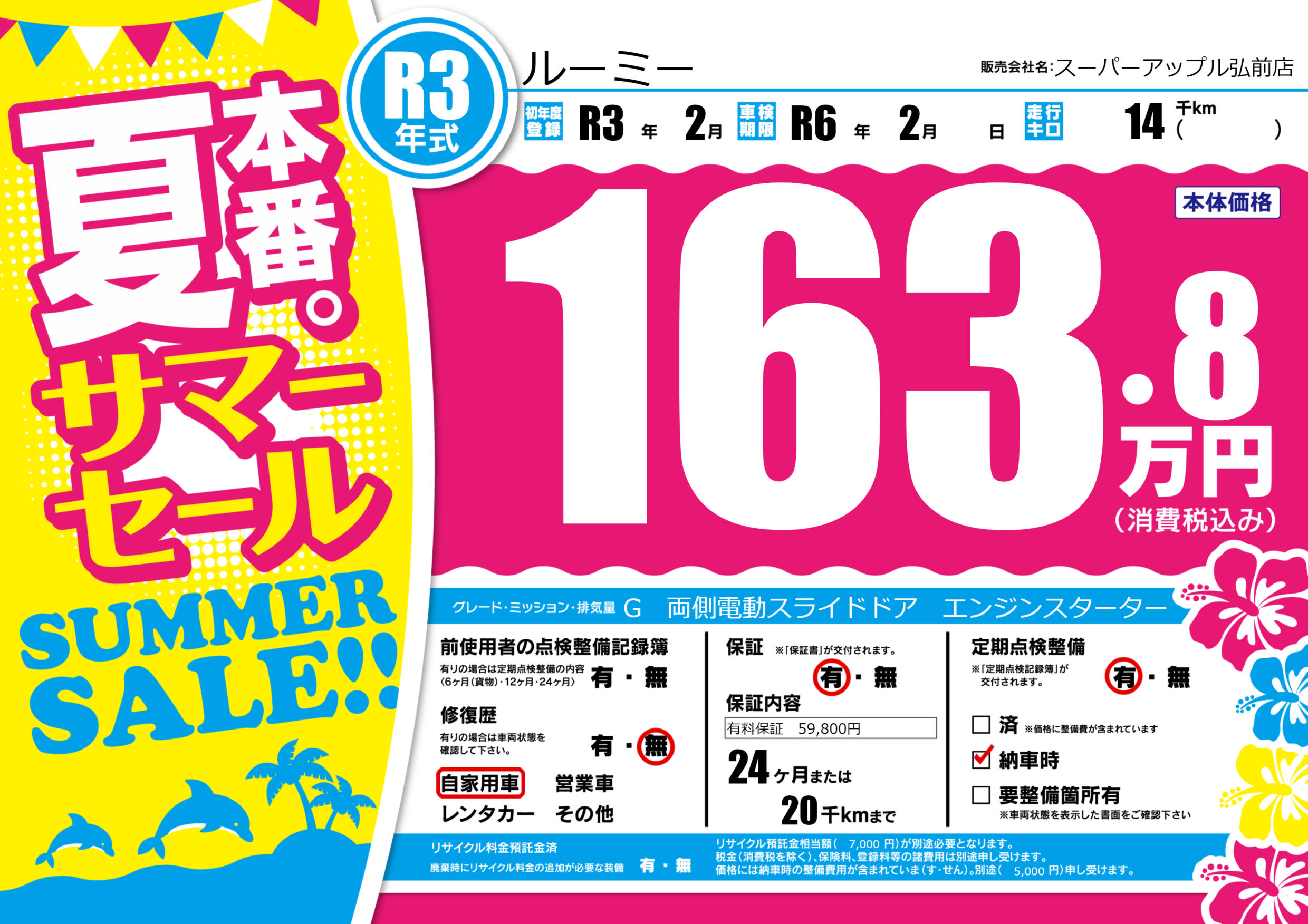 | 走行キロ | 1.4万km | 初年度登録 | R3年2月 |