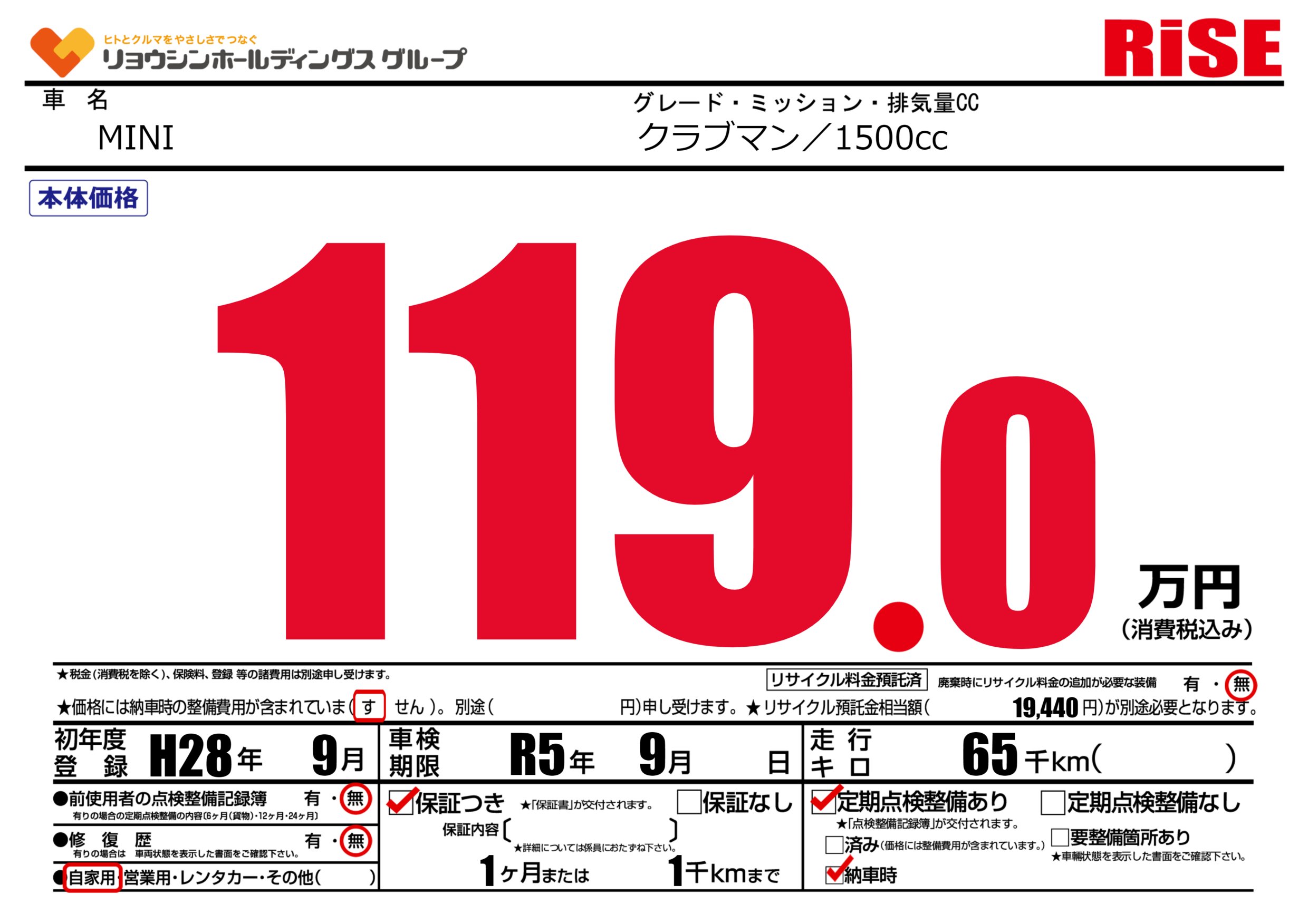| 車検制限 | R5年 9月 - 日 | ||