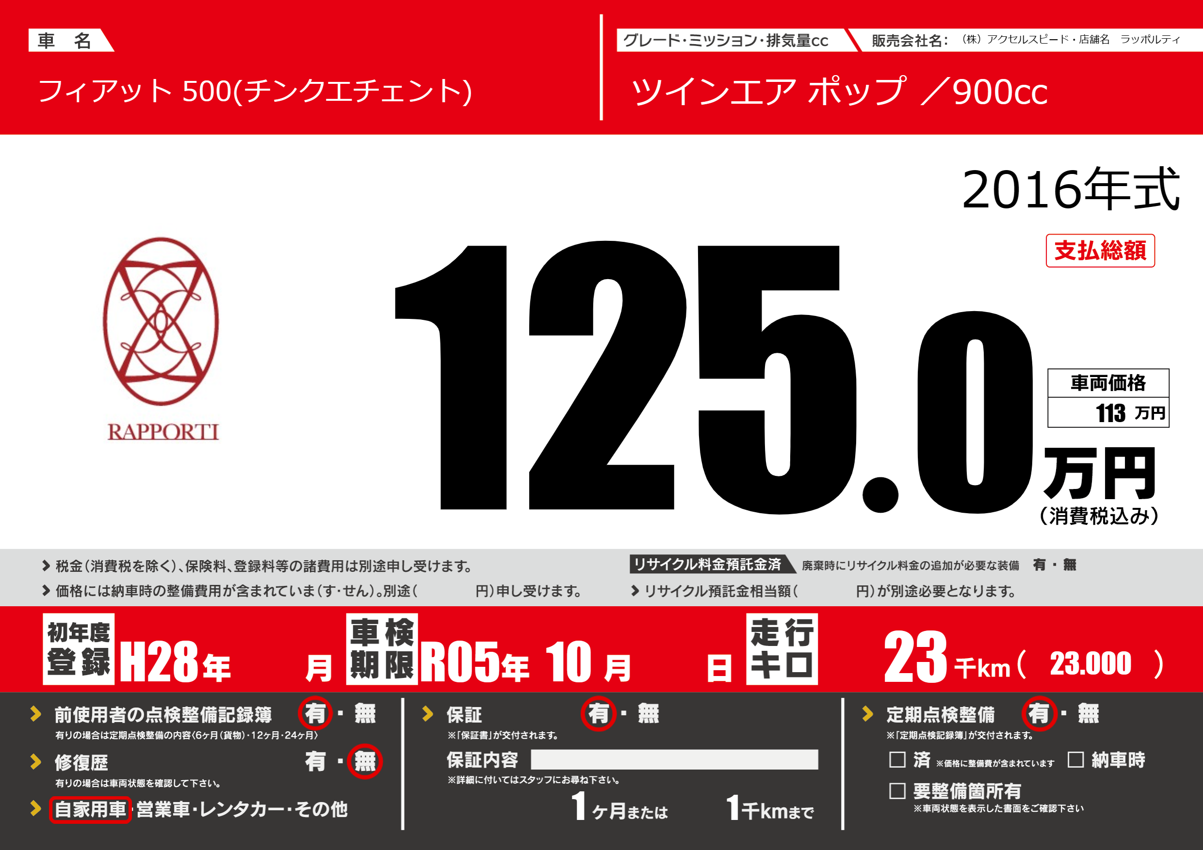 | 車名 | フィアット 500(チンクエチェント) | グレード ミッション 排気量 |