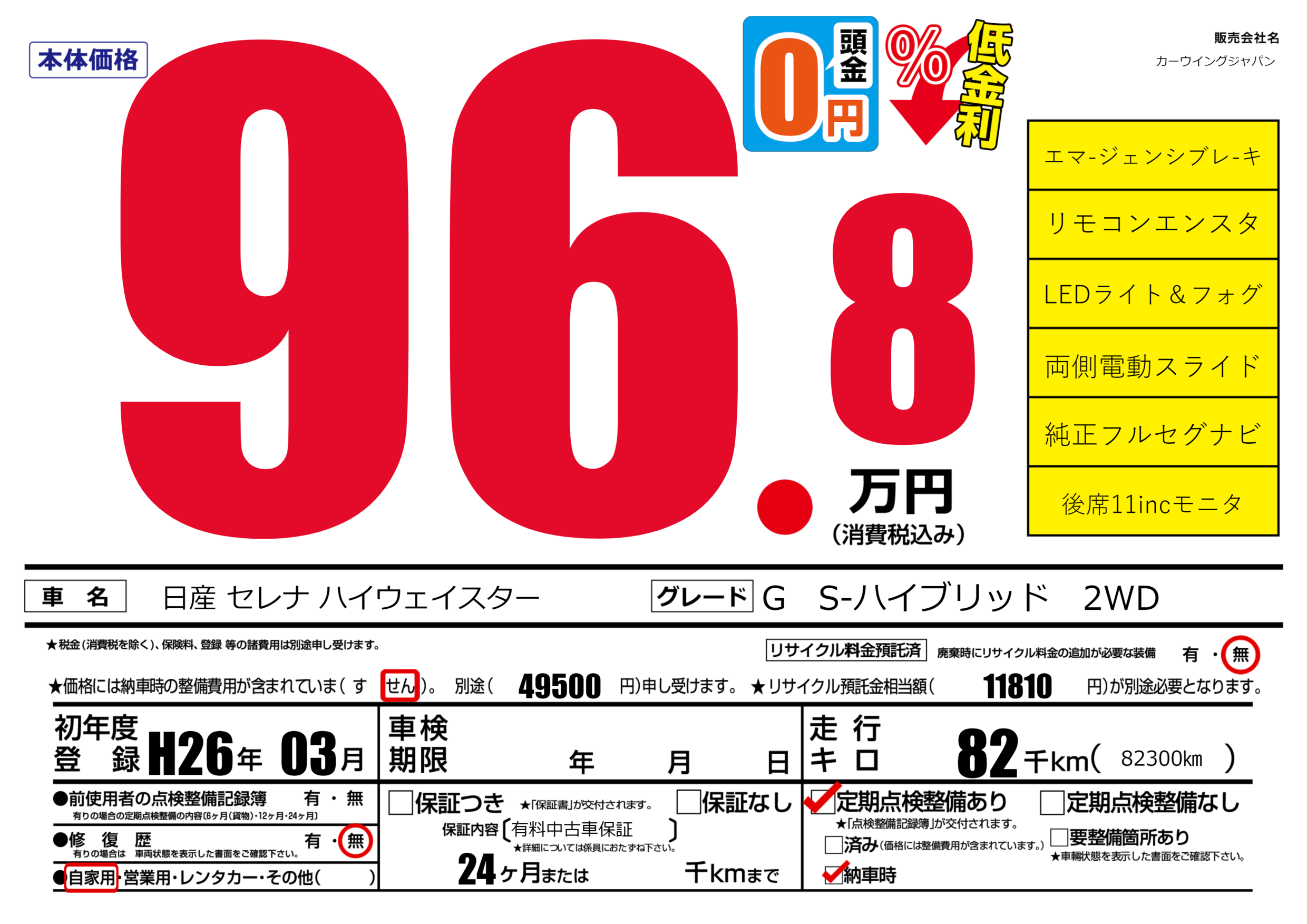 保証なし 保証内容(有料中古車保証) 24ヶ月または千km |