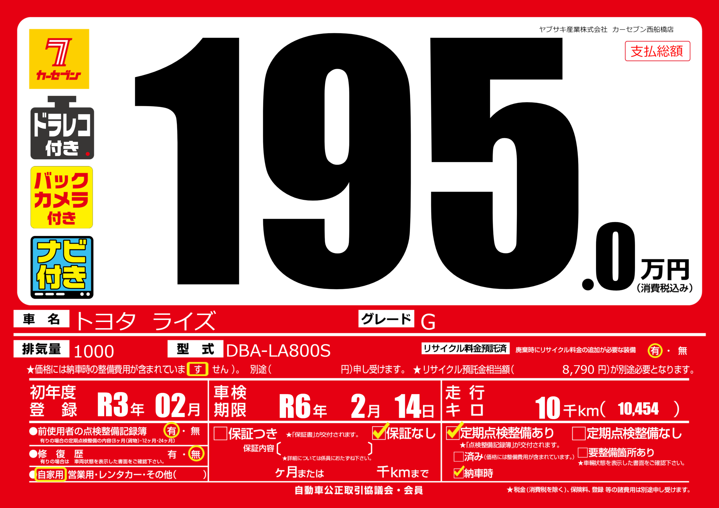 | 車名 | トヨタ ライズ | グレード ミッション 排気量 |