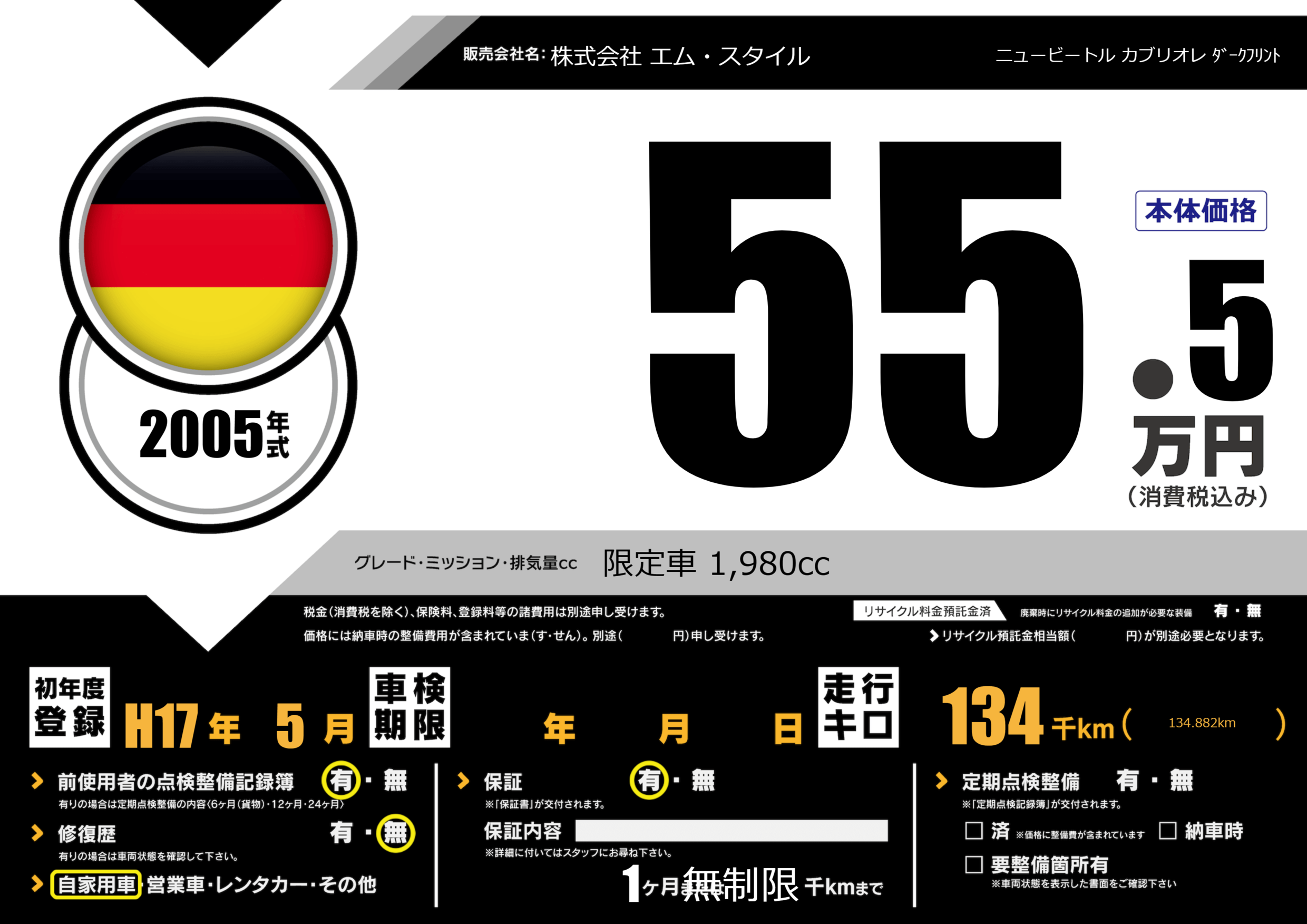 | 車名 | ニュービートル カブリオレ ダークフリント | グレード ミッション 排気量 |