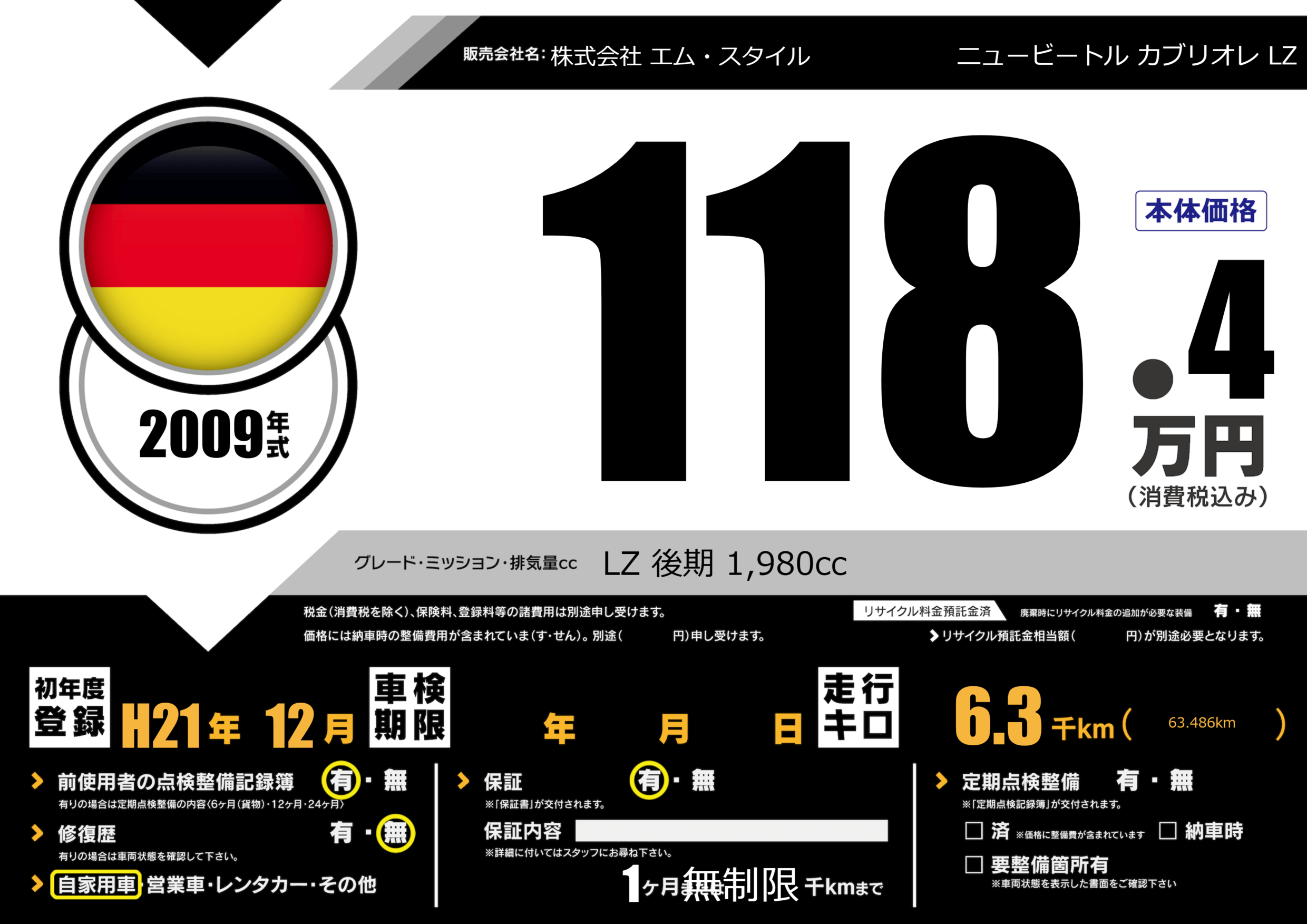 | 車名 | ニュービートル カブリオレ LZ | グレード ミッション 排気量 |