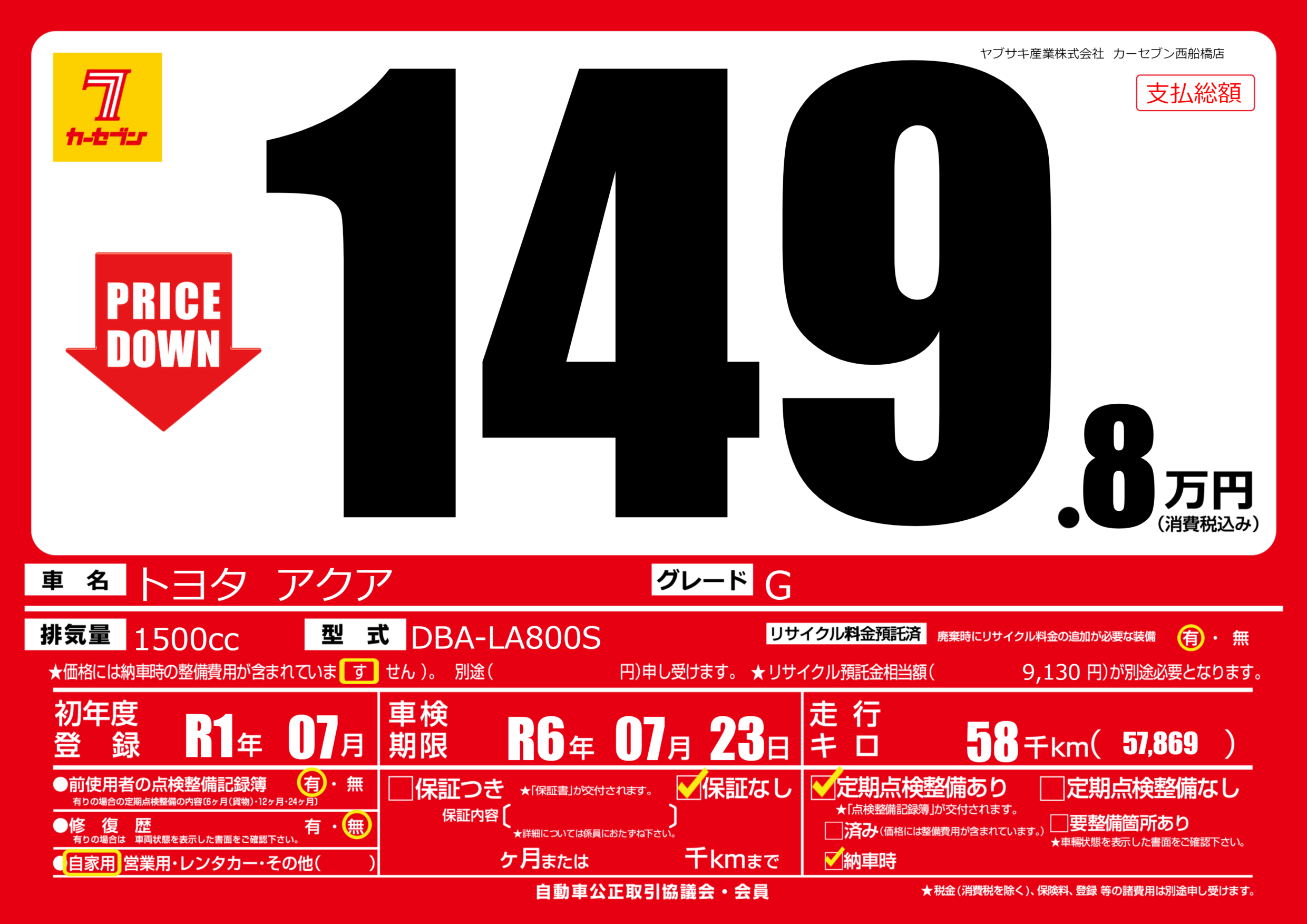 | 車名 | トヨタ アクア | グレード ミッション 排気量 |