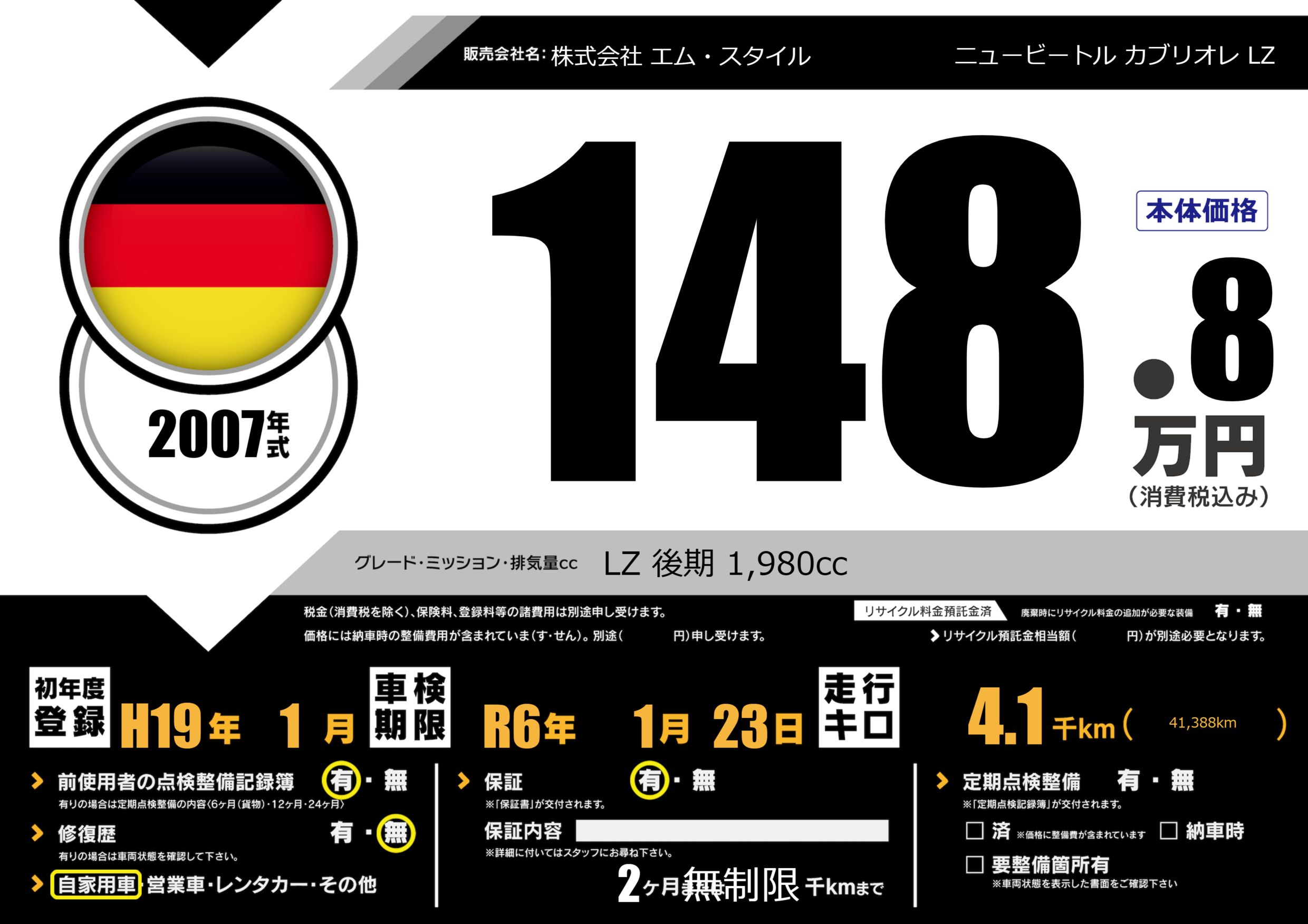 | 車名 | ニュービートル カブリオレ LZ | グレード ミッション 排気量 |