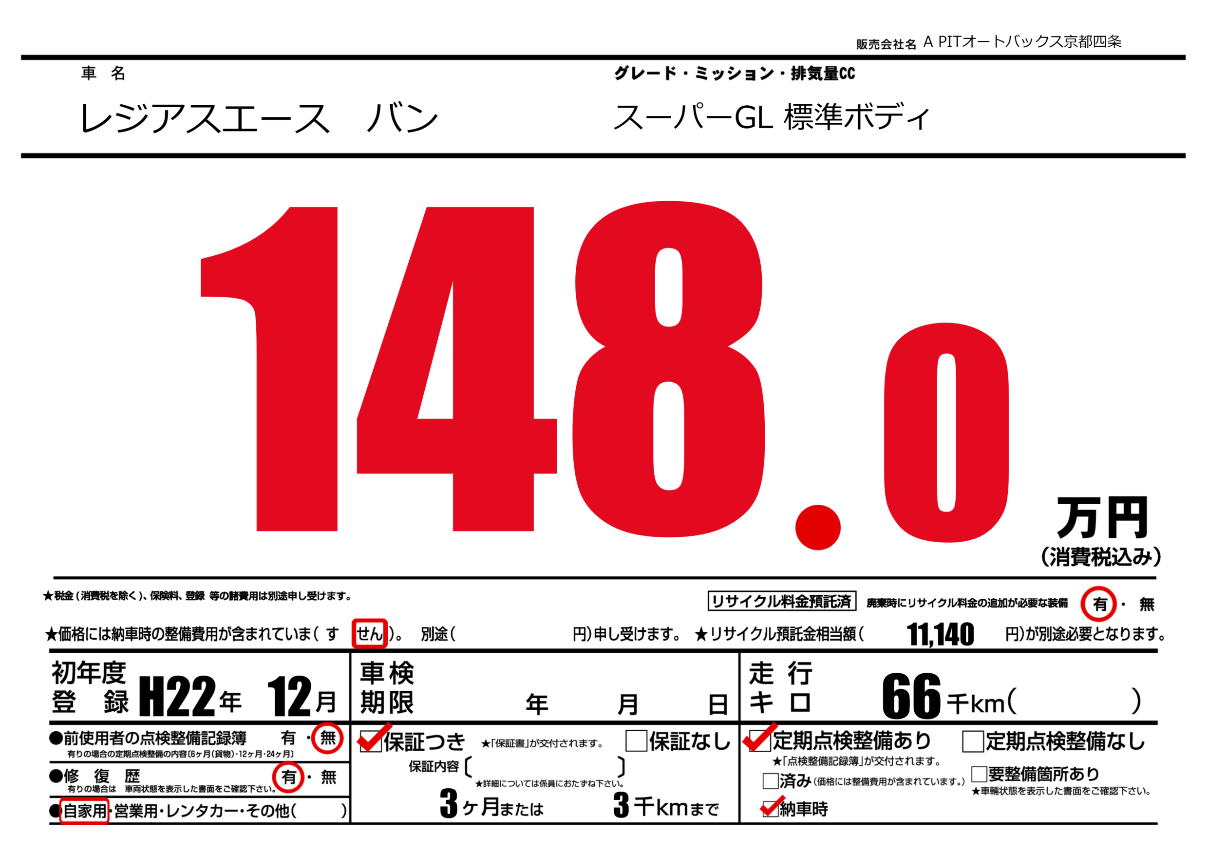| 走行キロ | 6.6万km | 初年度登録 | H22年12月 |