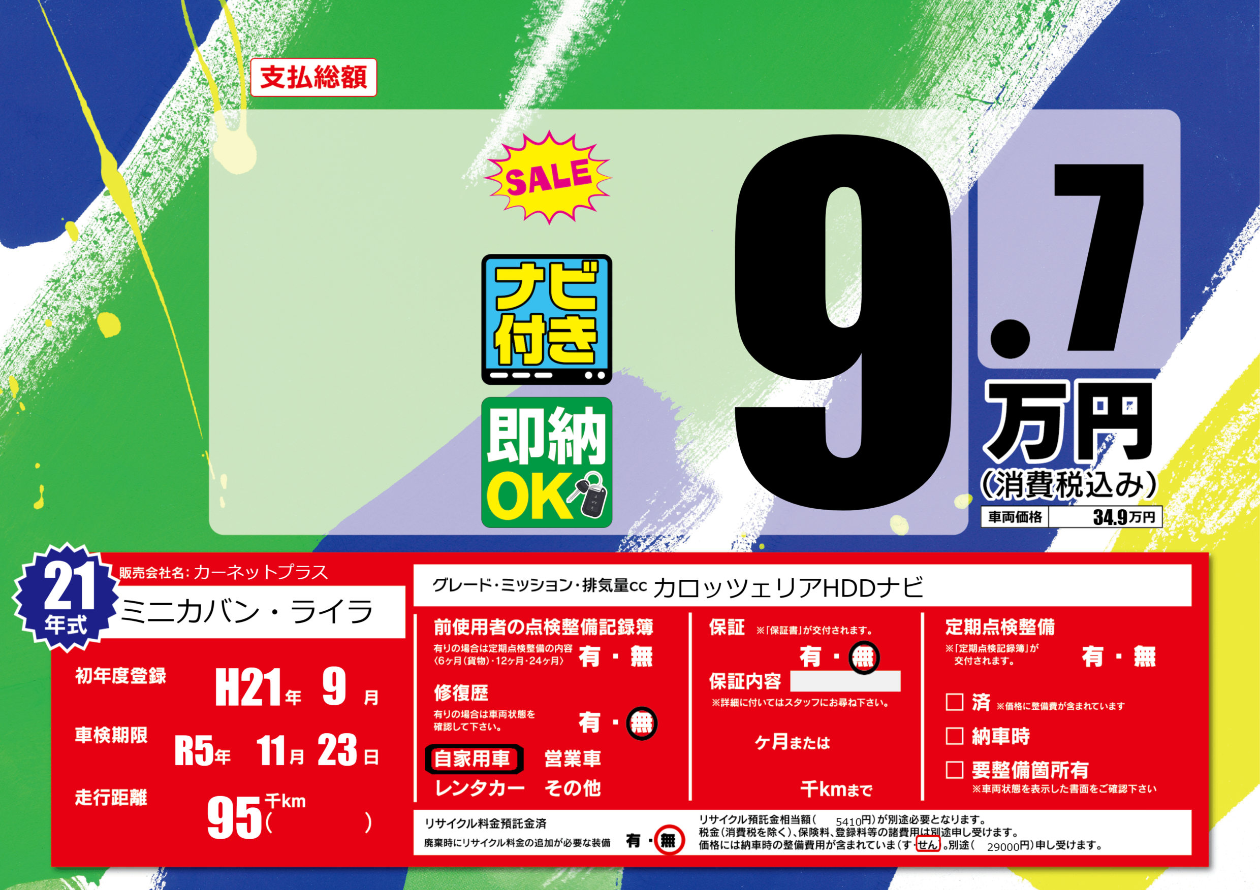 | 走行キロ | 9.5万km | 初年度登録 | H21年9月 |