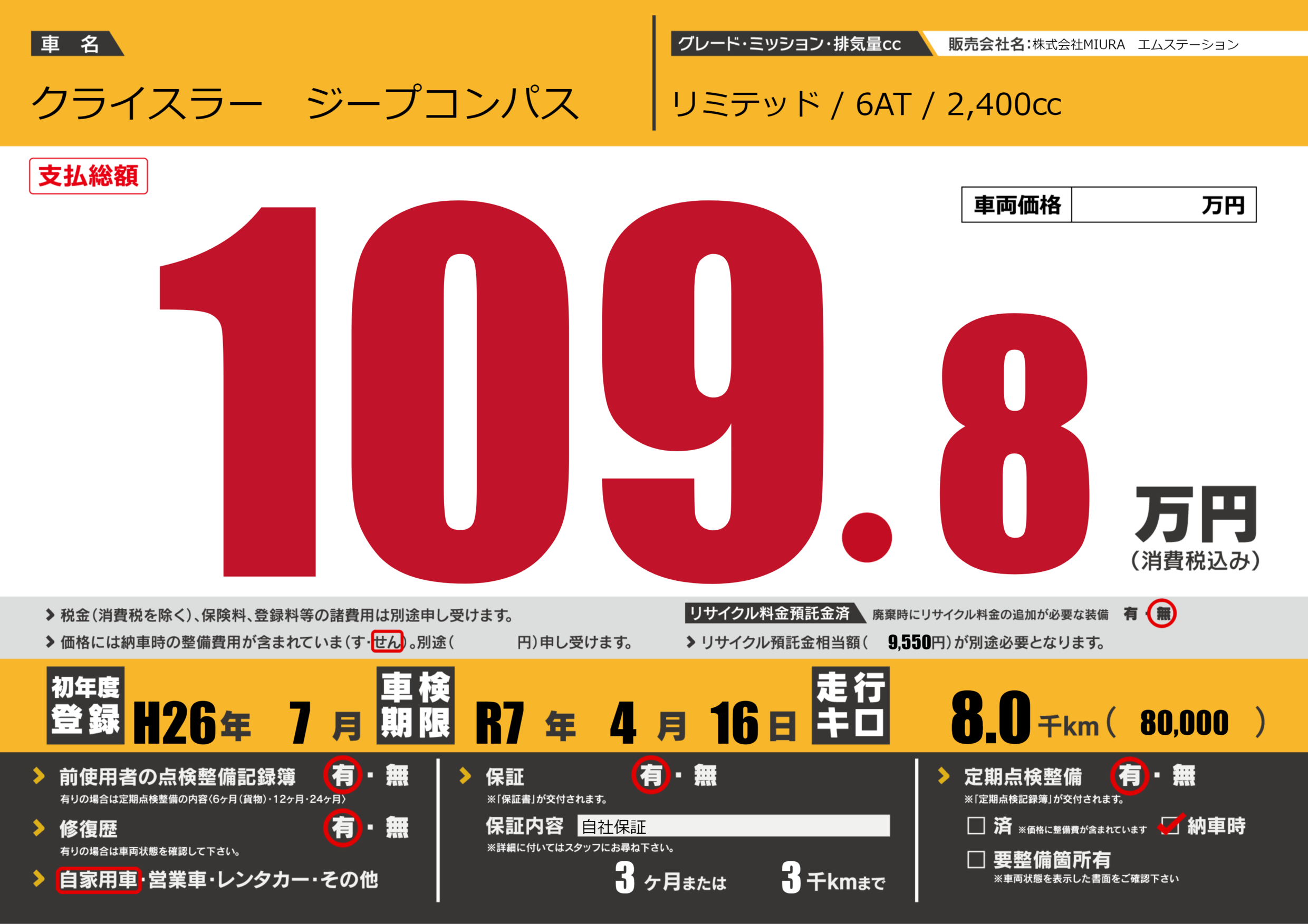 保証付き 保証内容(自社保証) 3ヶ月または3千km |