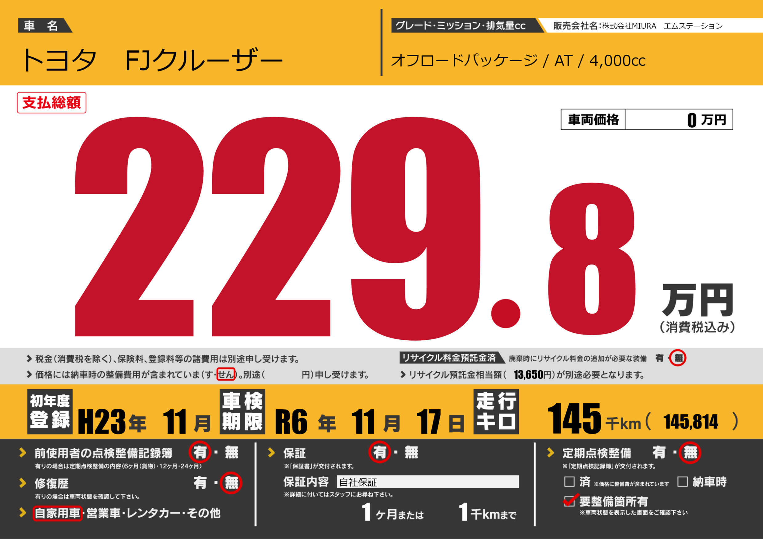 | 車名 | トヨタ FJクルーザー | グレード ミッション 排気量 |