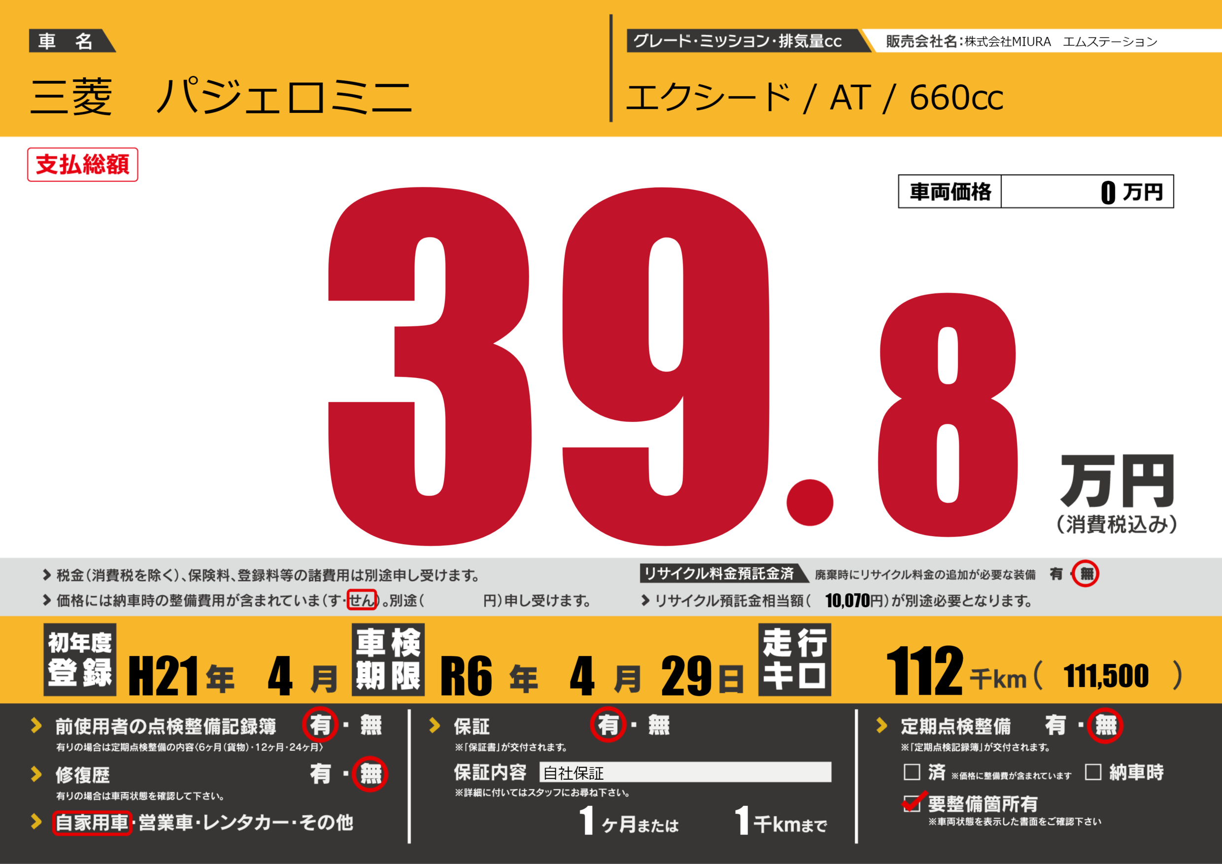 | 車名 | 三菱 パジェロミニ | グレード ミッション 排気量 |