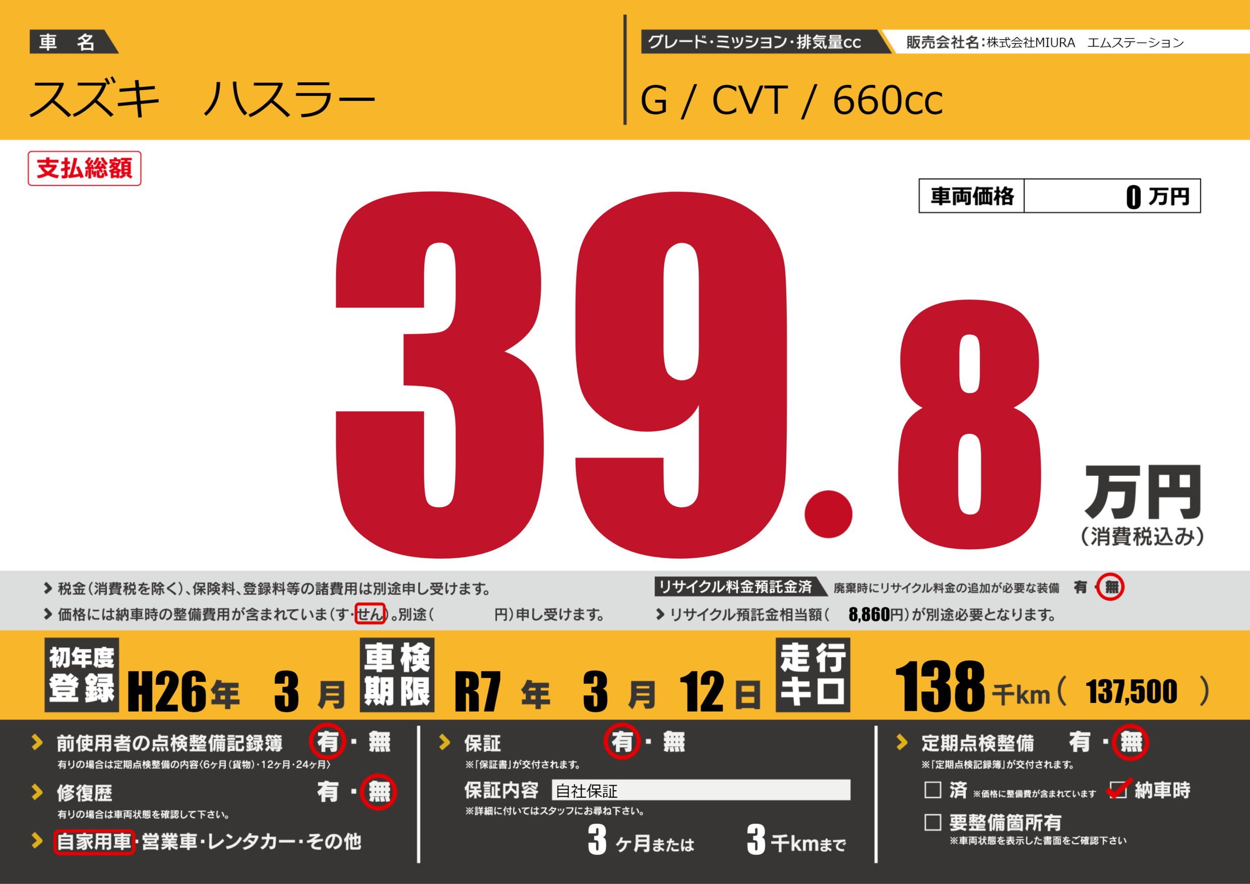 保証付き 保証内容(自社保証) 3ヶ月または(3)千kmまで |