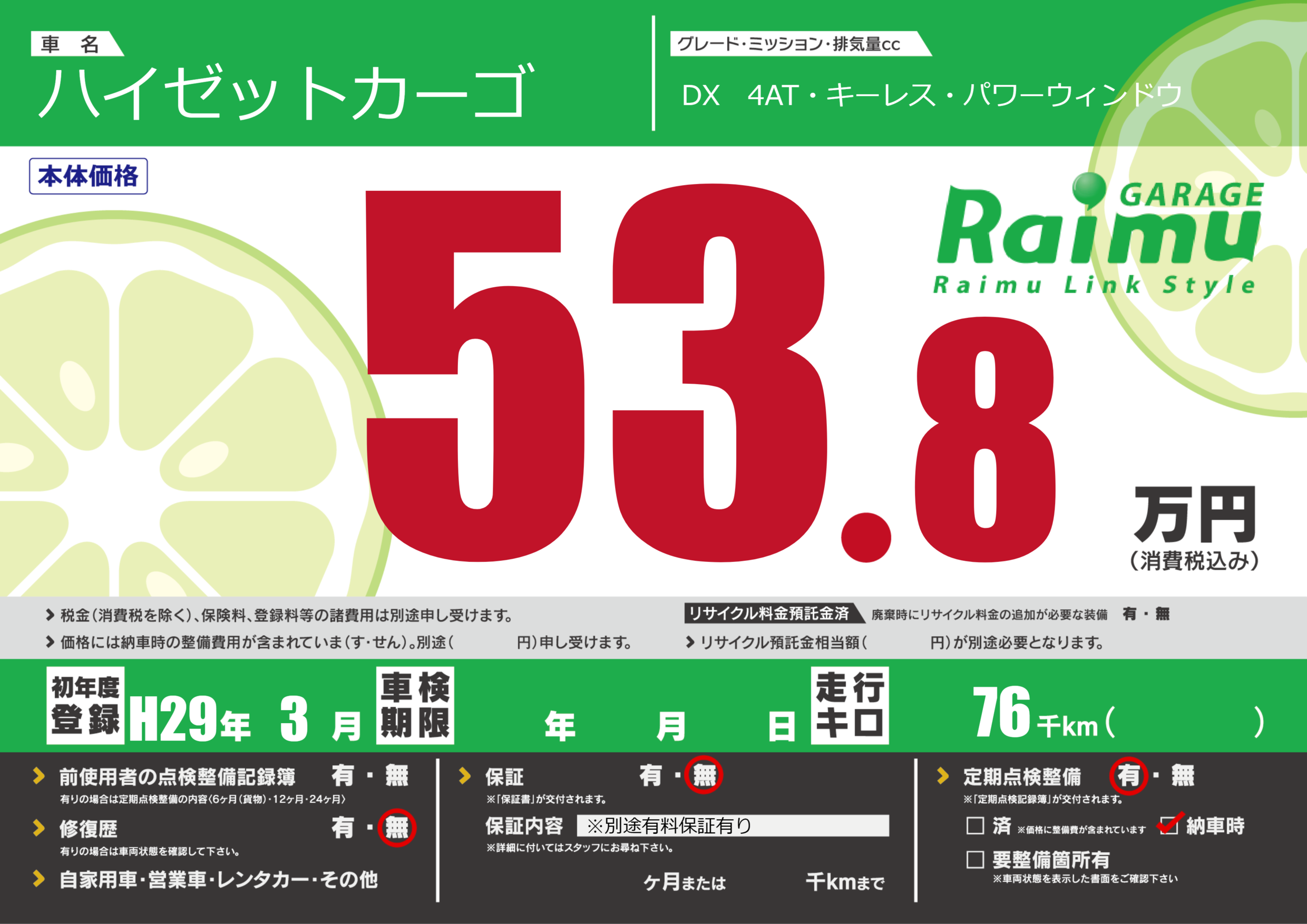 | 車名 | ハイゼットカーゴ | グレード ミッション 排気量 |