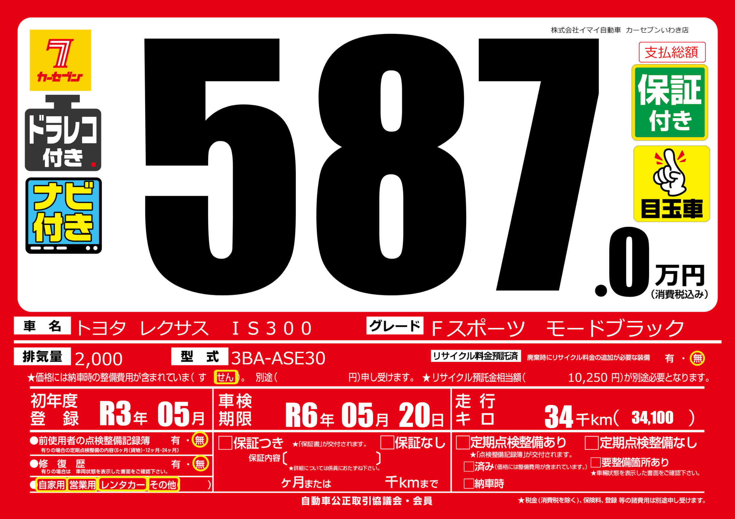 | 車名 | トヨタ レクサス IS300 | グレード ミッション 排気量 |