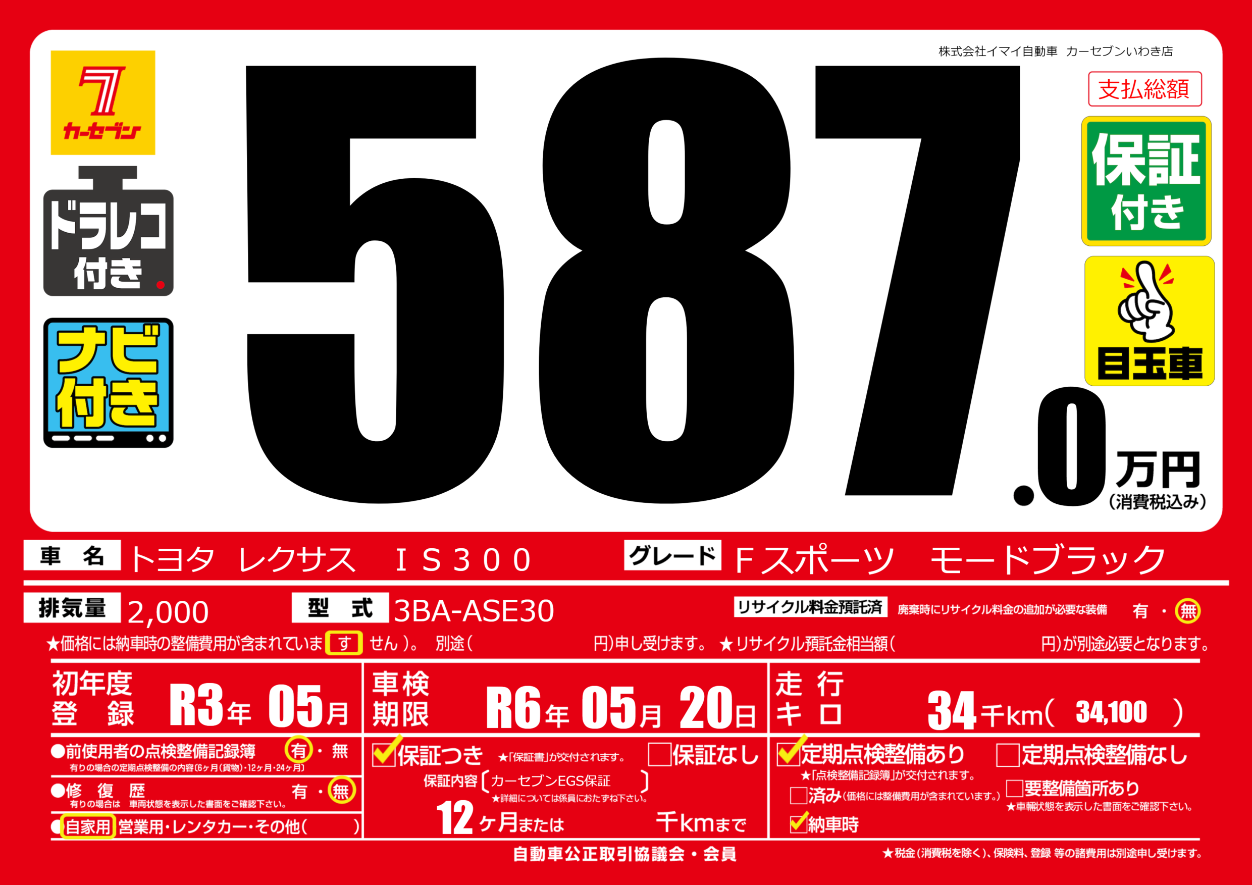 | 車名 | トヨタ レクサス IS300 | グレード ミッション 排気量 |