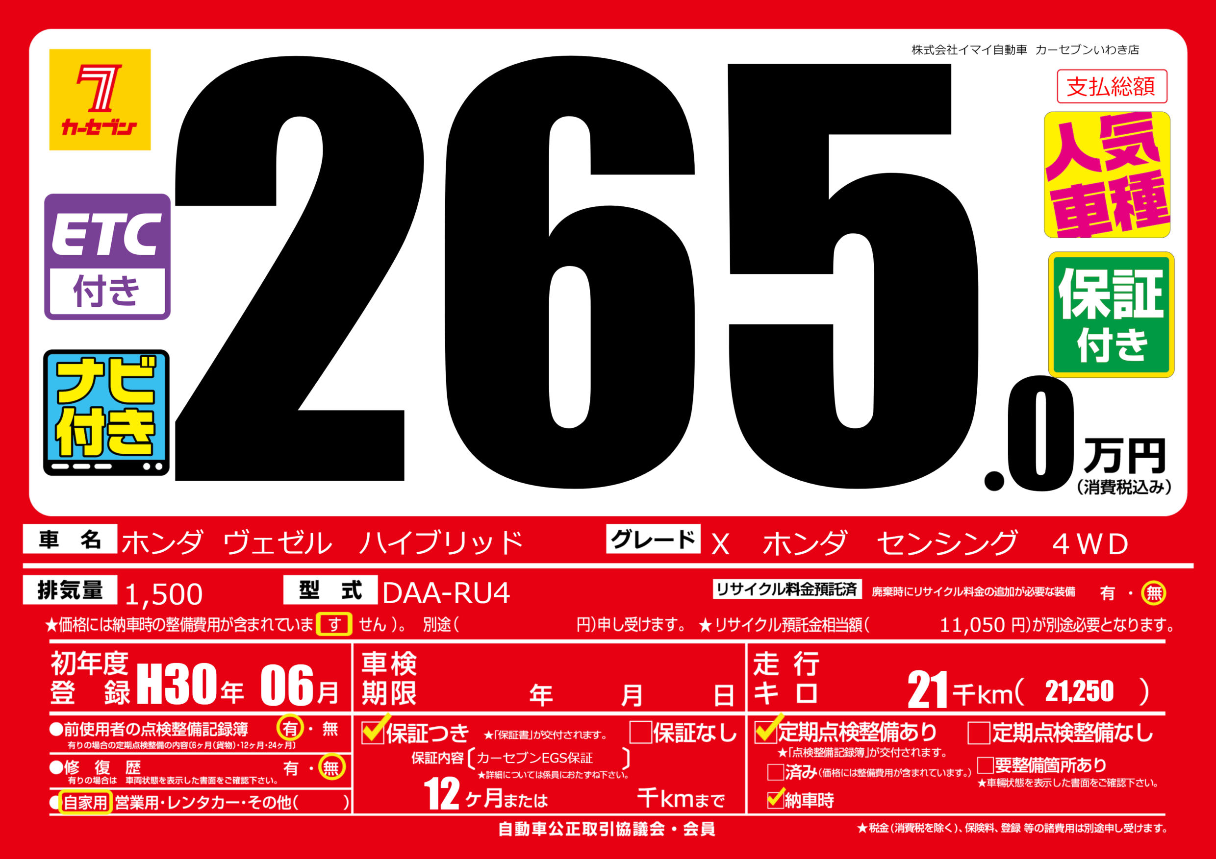 | 車名 | ホンダ ヴェゼル ハイブリッド | グレード ミッション 排気量 |