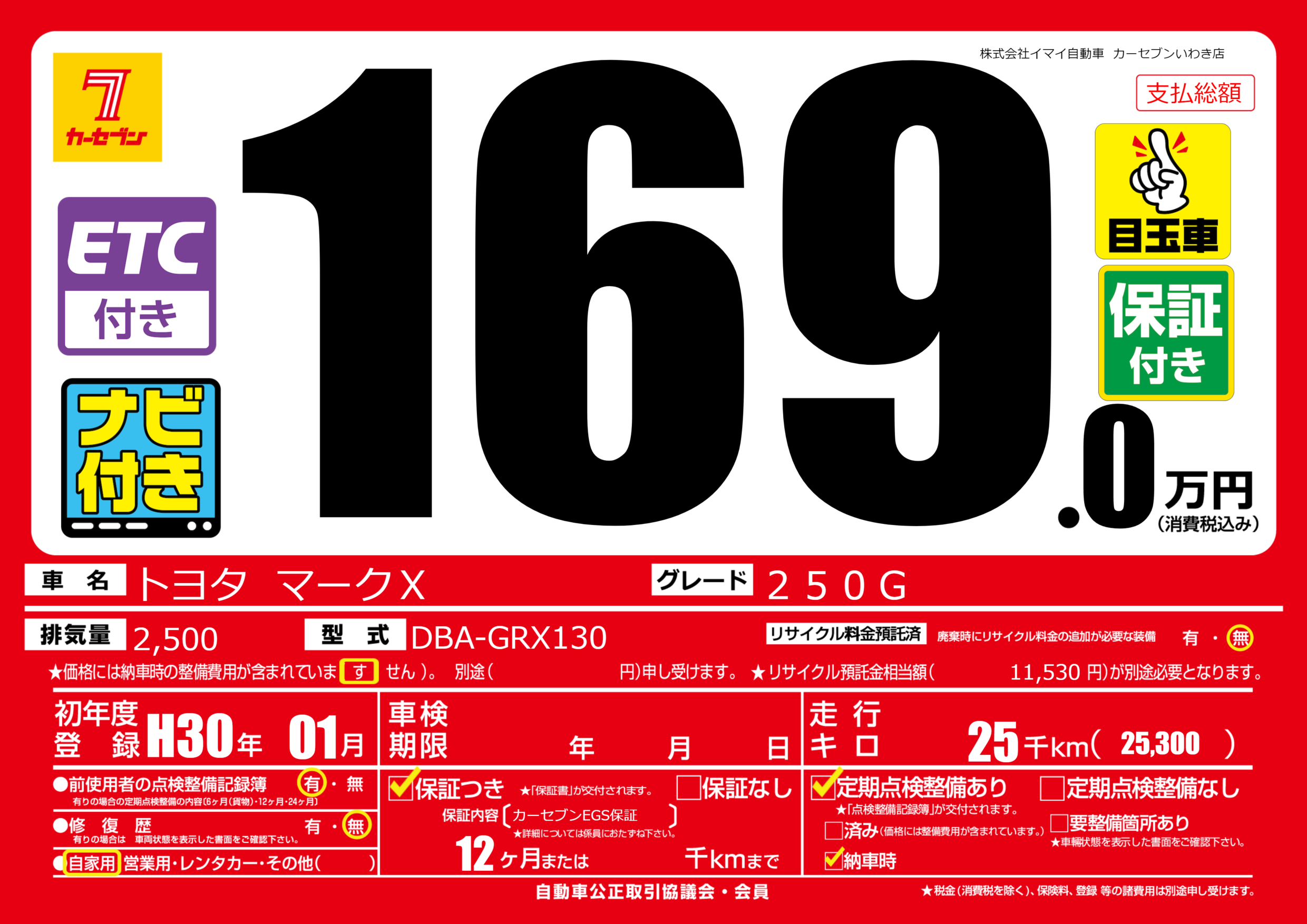 保証付き 保証内容(カーセブンEGS保証) 12ヶ月または千km |