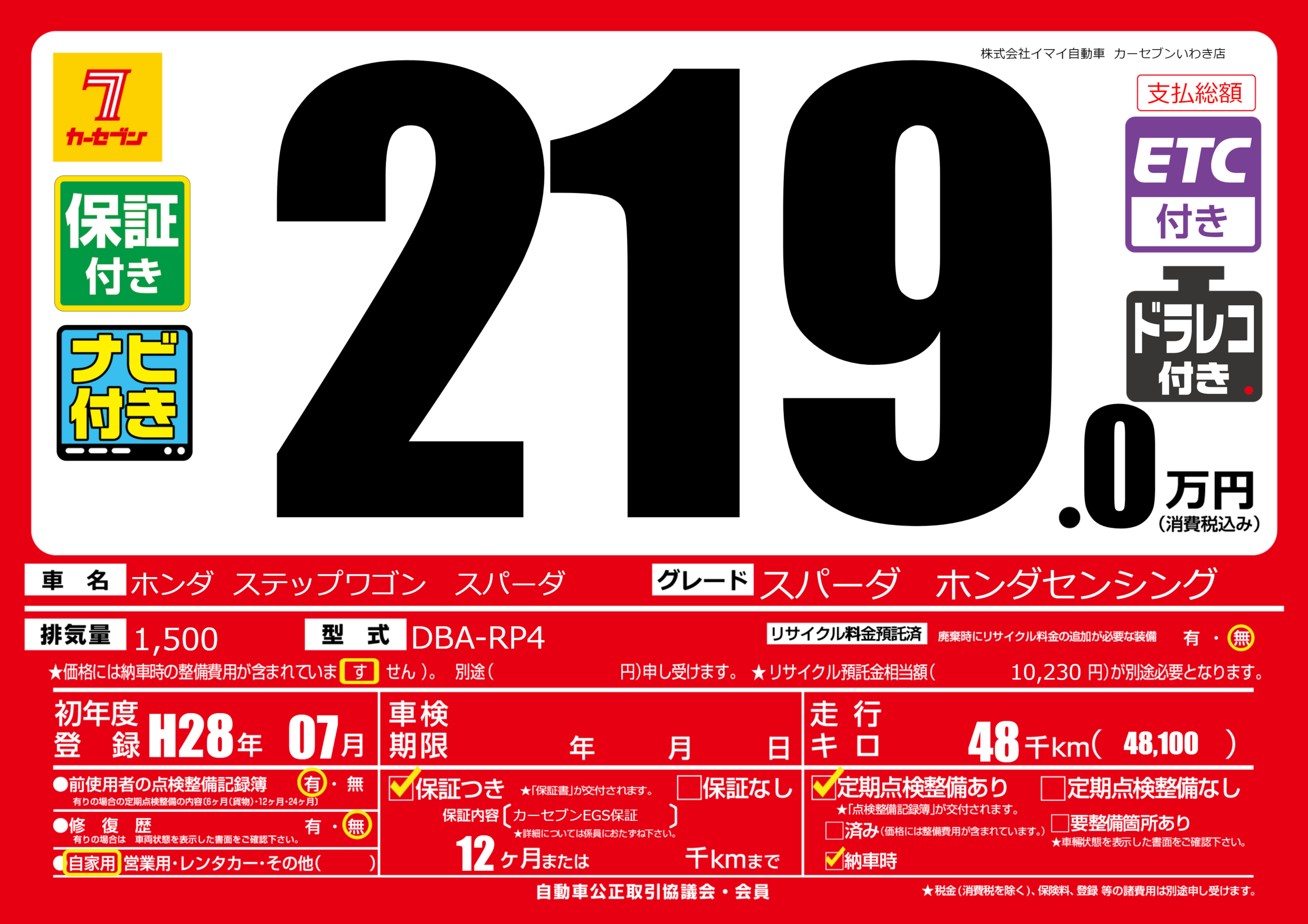 | 走行キロ | 4.8万km | 初年度登録 | H28年07月 |