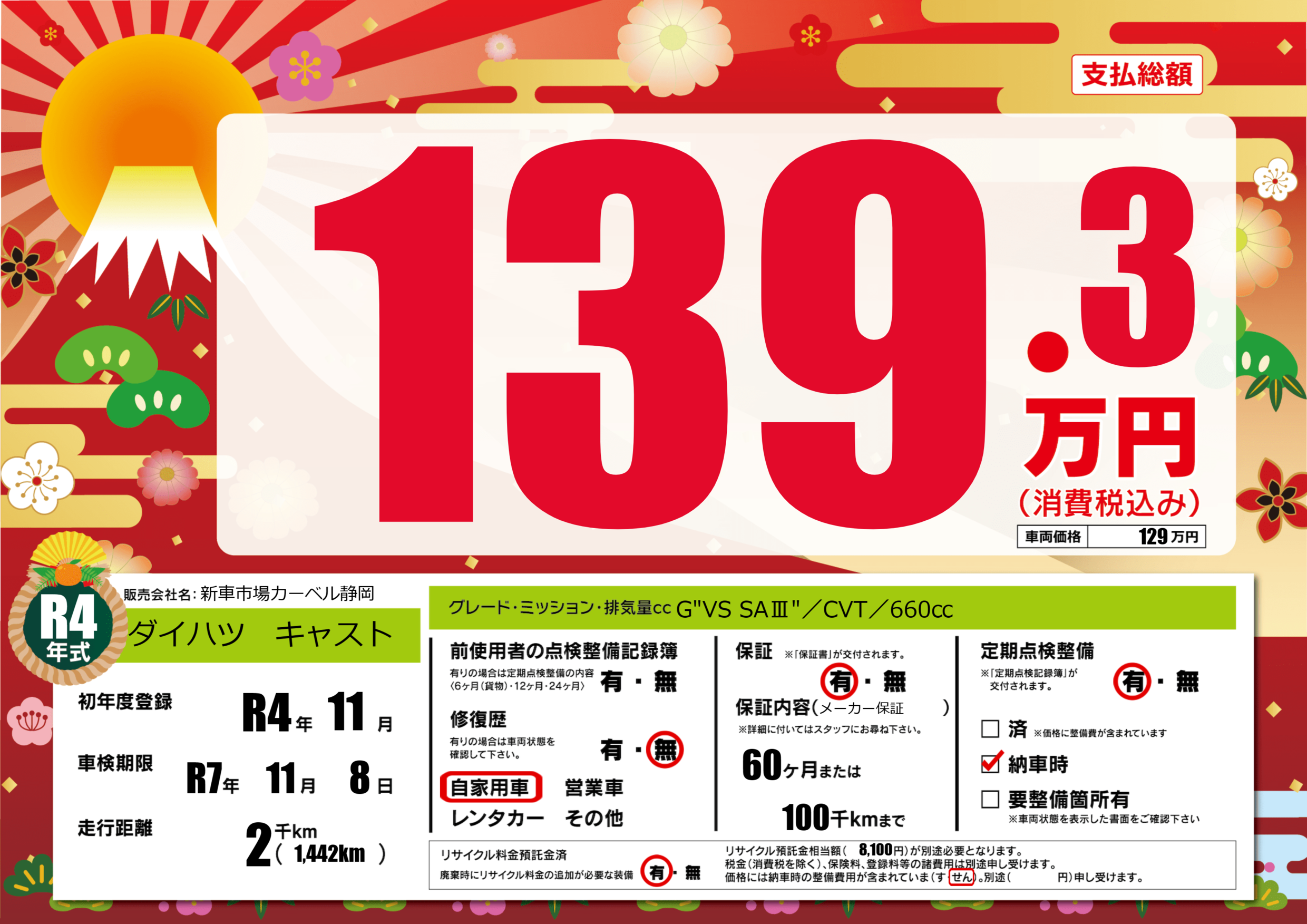 | 走行キロ | 0.2万km | 初年度登録 | R4年11月 |