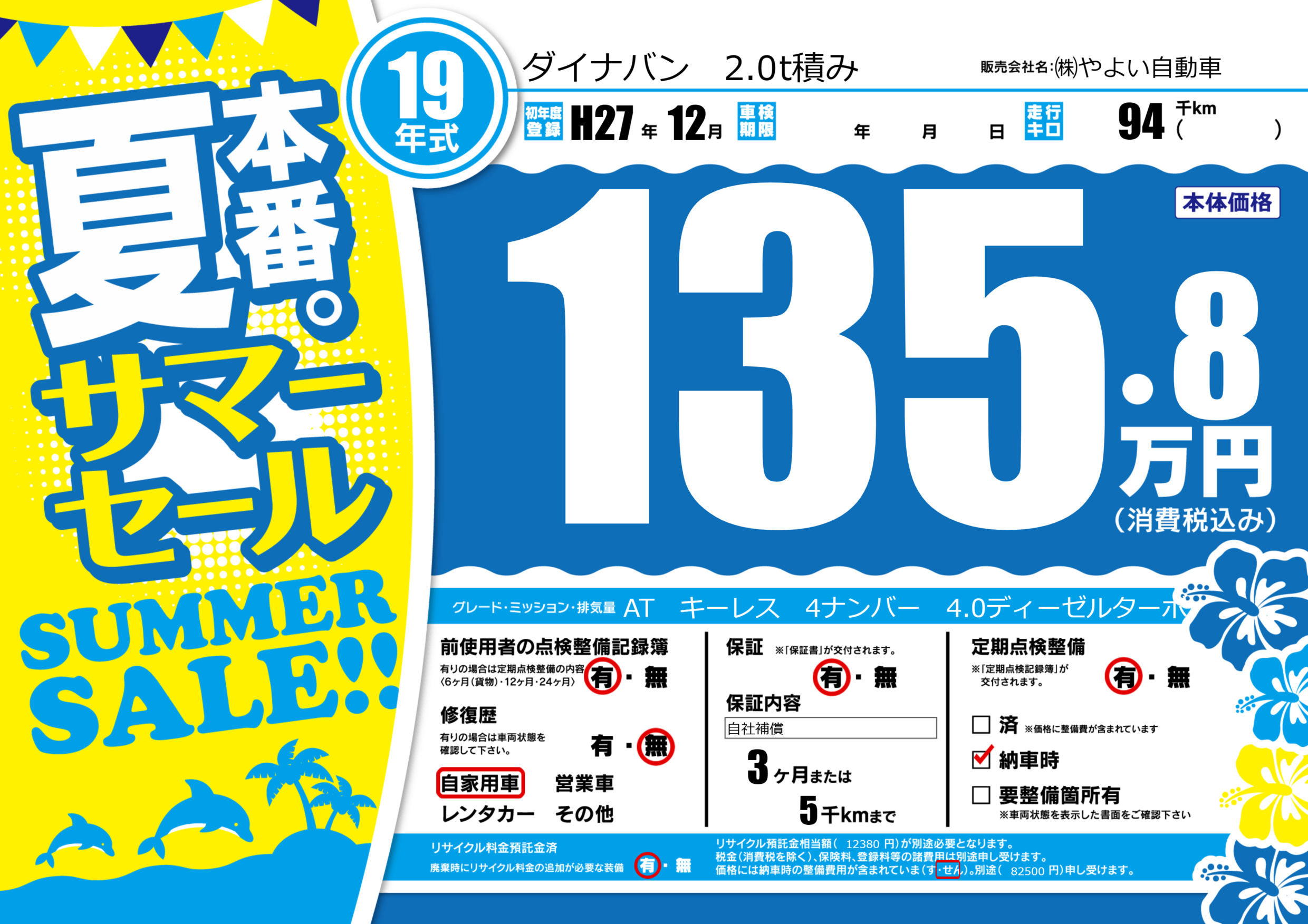 | 走行キロ | 9.4万km | 初年度登録 | H27年12月 |