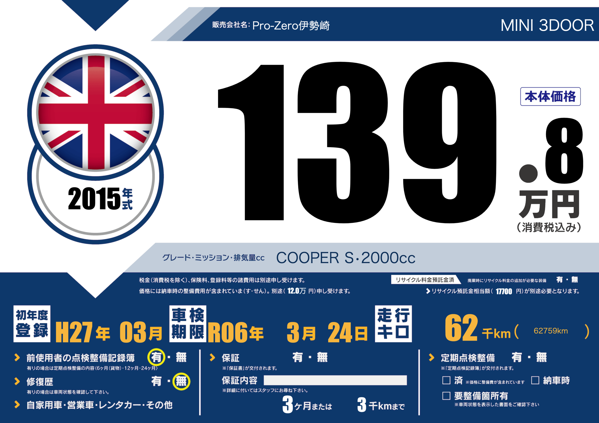 | 車名 | MINI 3DOOR | グレード ミッション 排気量 |
