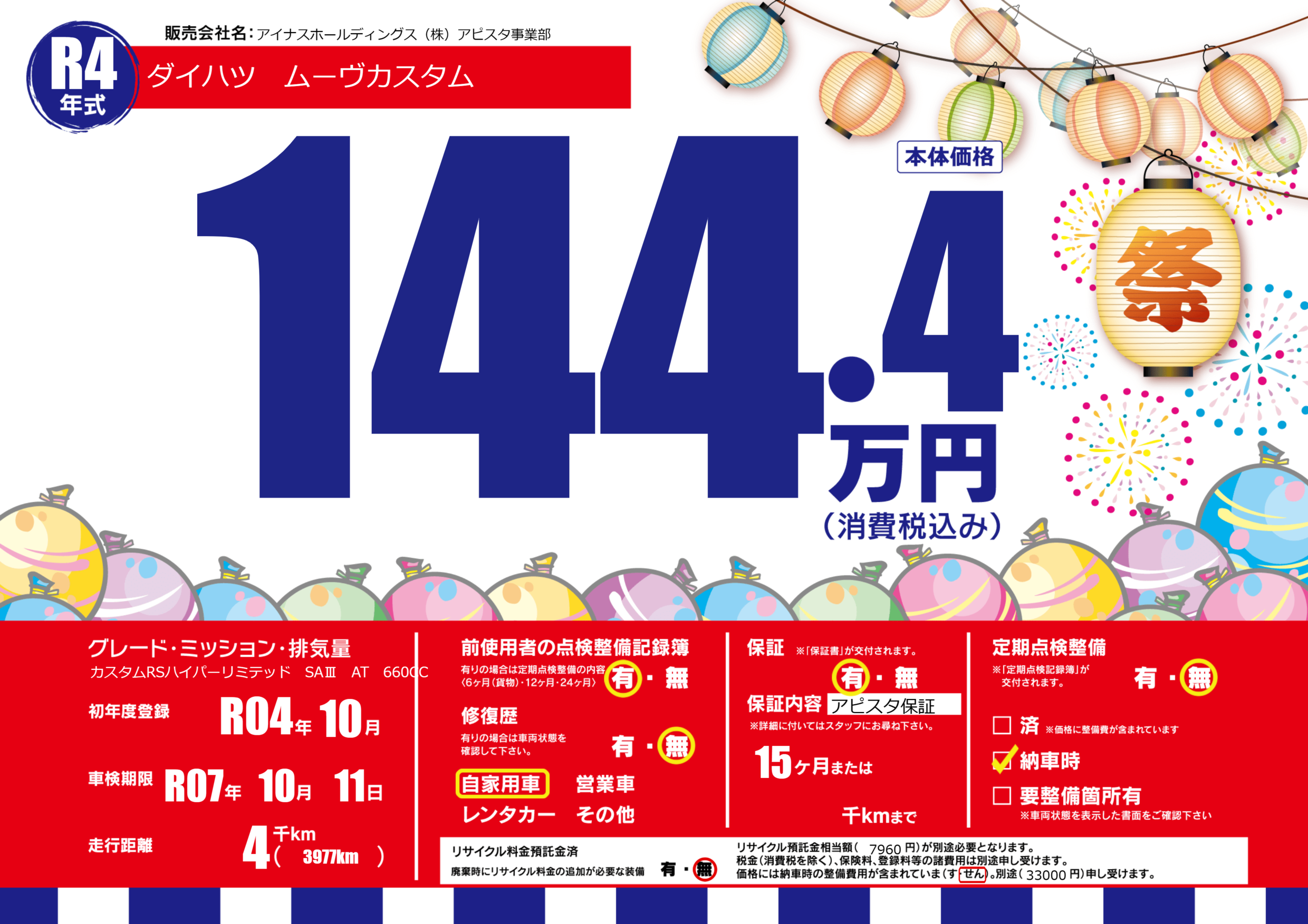 | 走行キロ | 0.4万km | 初年度登録 | R04年10月 |