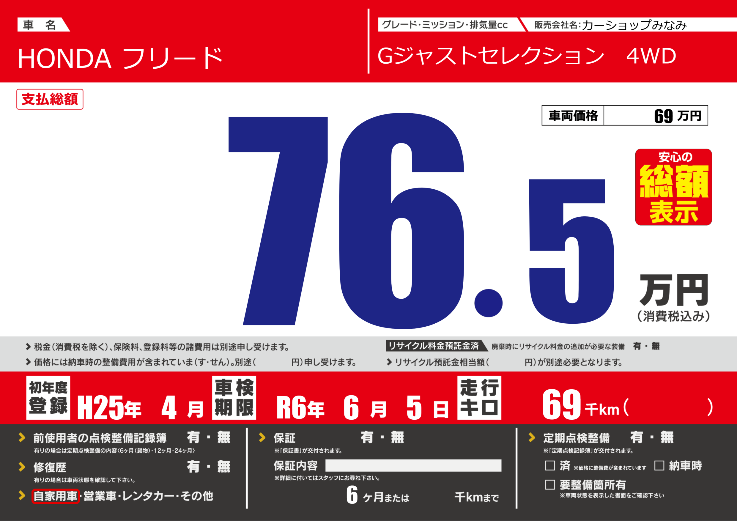 | 車名 | HONDA フリード | グレード ミッション 排気量 |