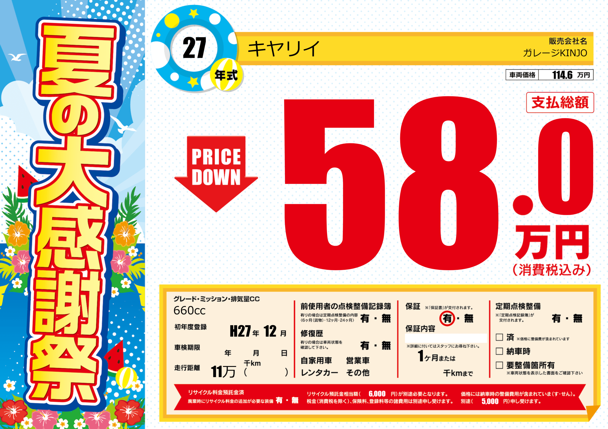 保証付き 保証内容(---) 1ヶ月または()千kmまで |