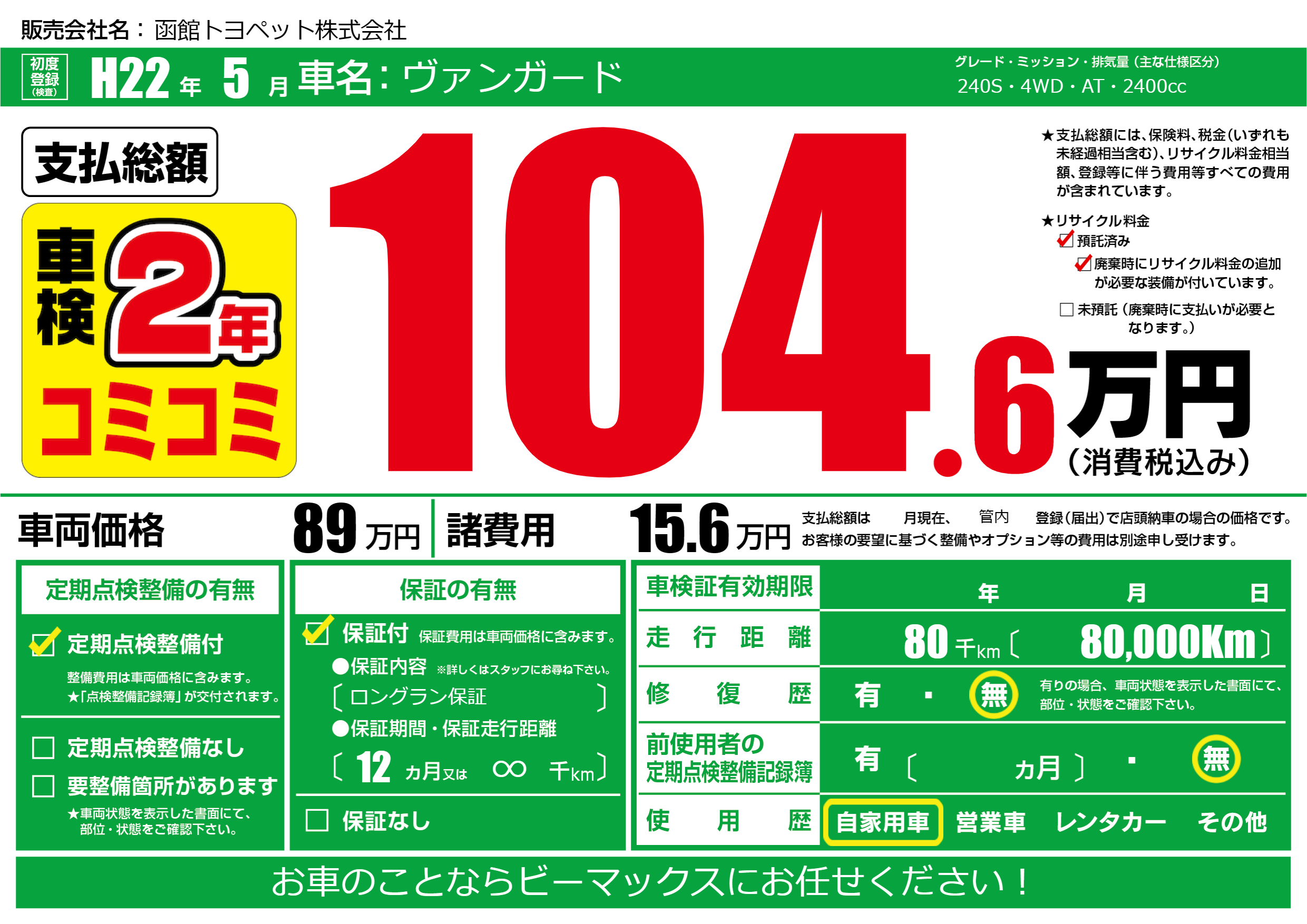 | 走行キロ | 8万km | 初年度登録 | H22年5月 |
