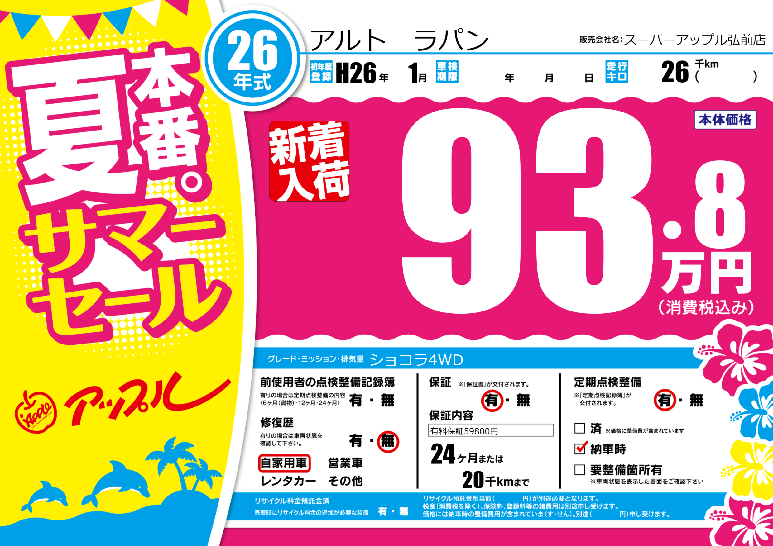 | 走行キロ | 2.6万km | 初年度登録 | H26年1月 |