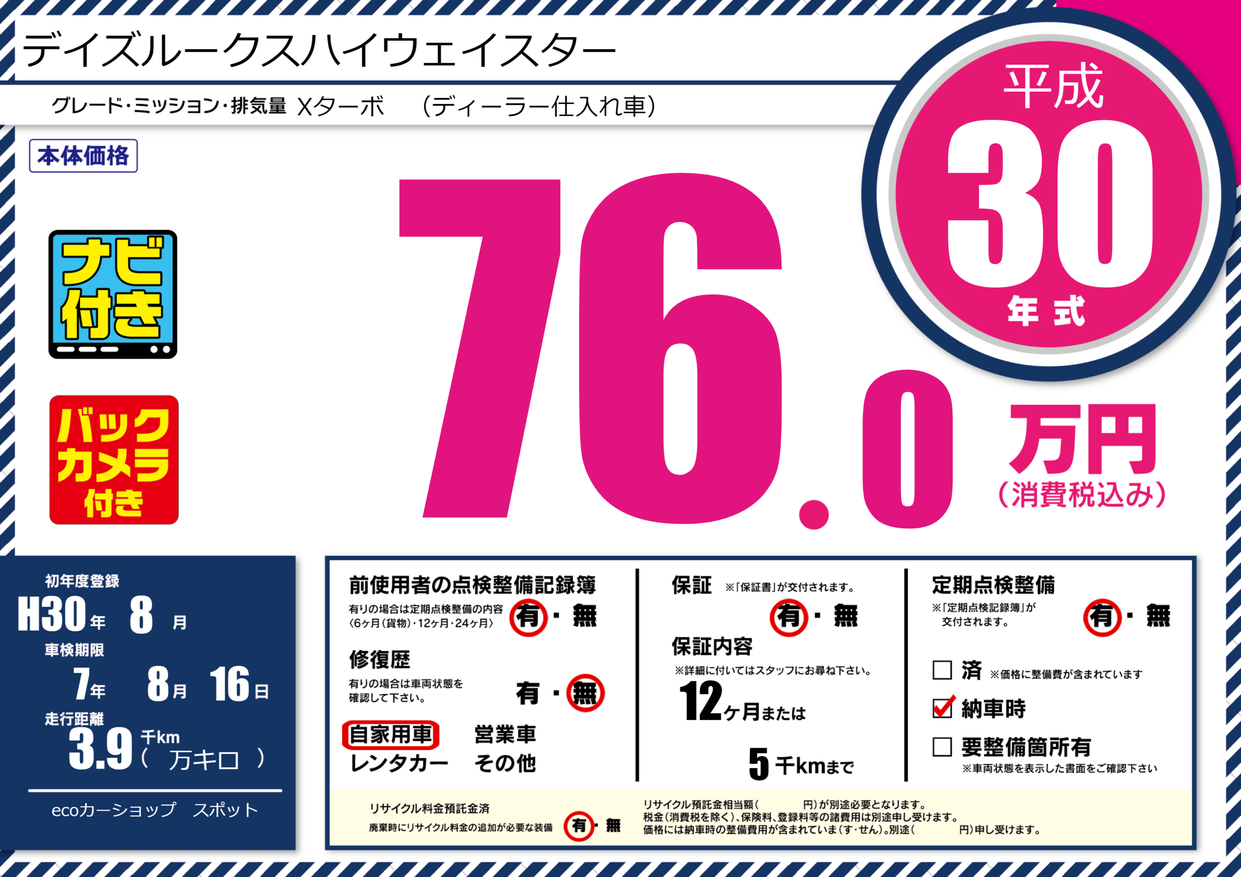 | 車名 | デイズルークスハイウェイスター | グレード ミッション 排気量 |