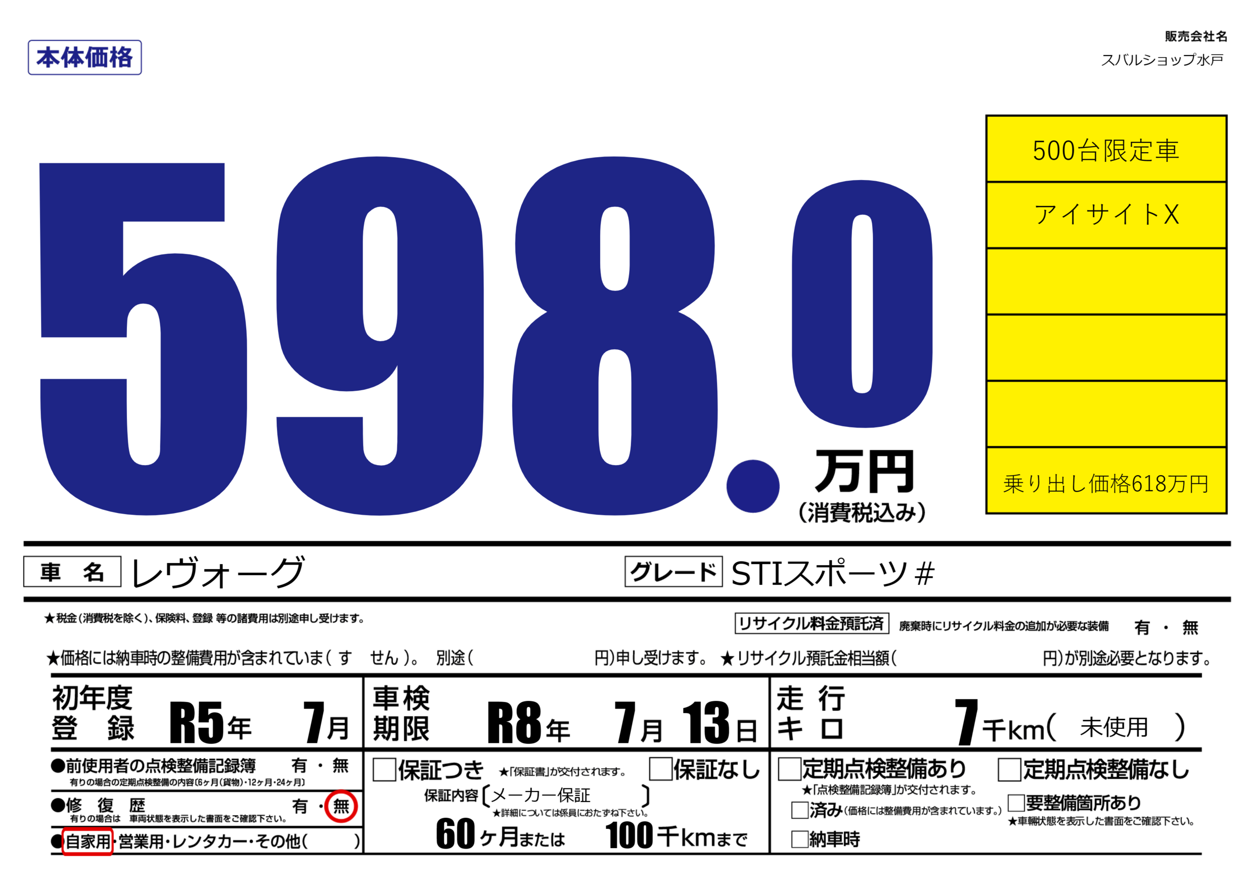 | 車名 | レヴォーグ | グレード ミッション 排気量 |