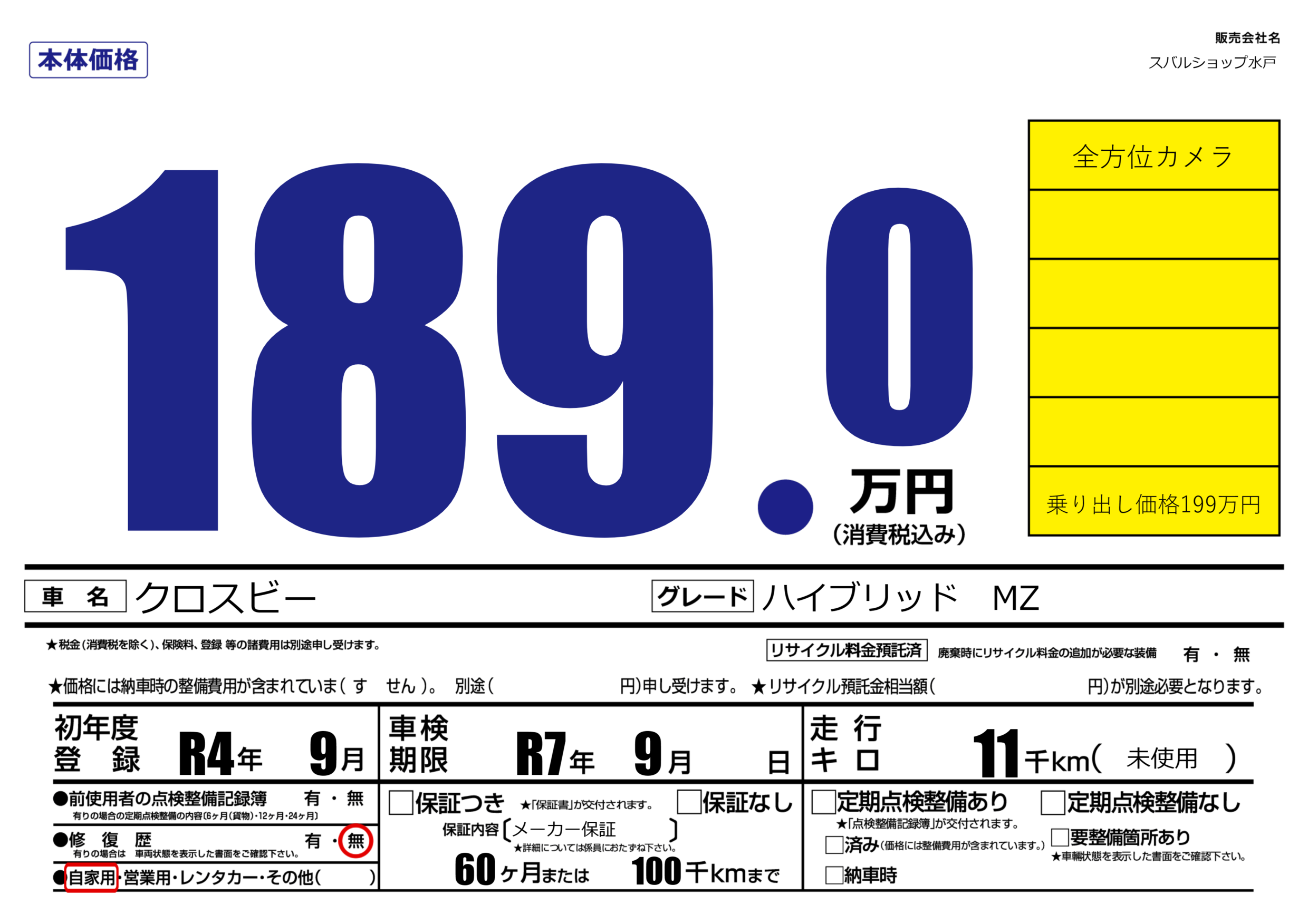 | 車検制限 | R7年 9月 - 日 | ||