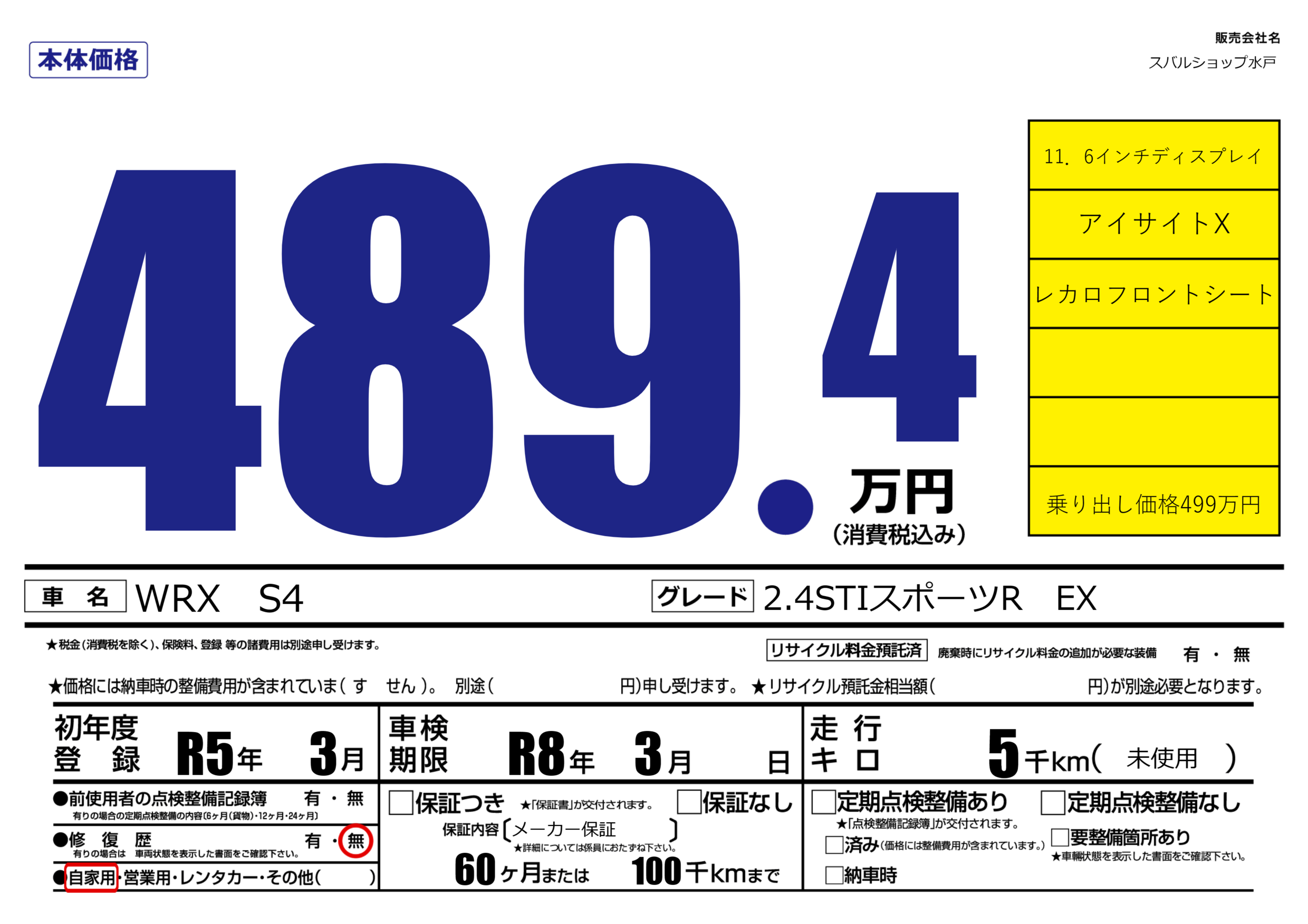 | 車名 | WRX S4 | グレード ミッション 排気量 |