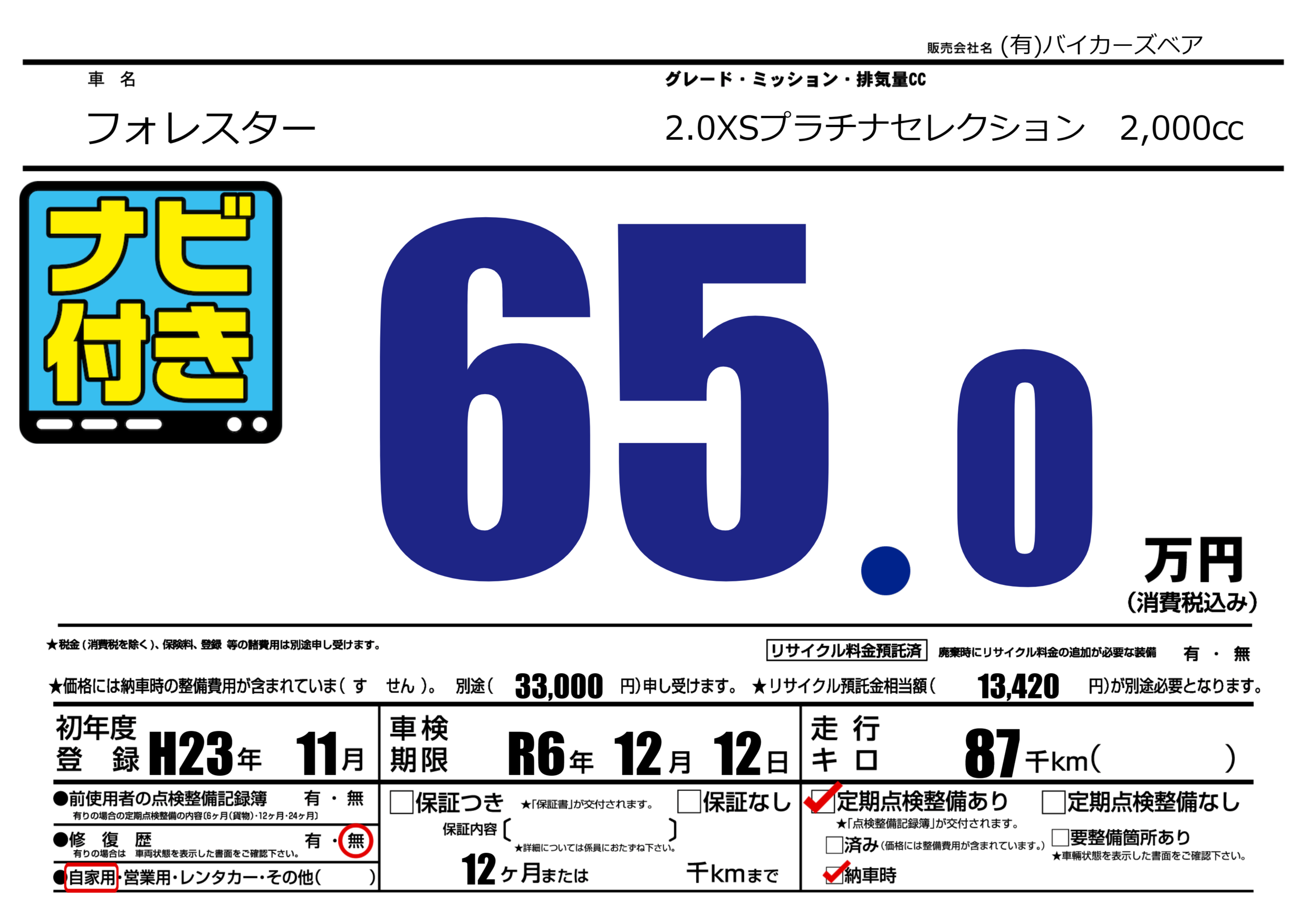 | 車名 | フォレスター | グレード ミッション 排気量 |