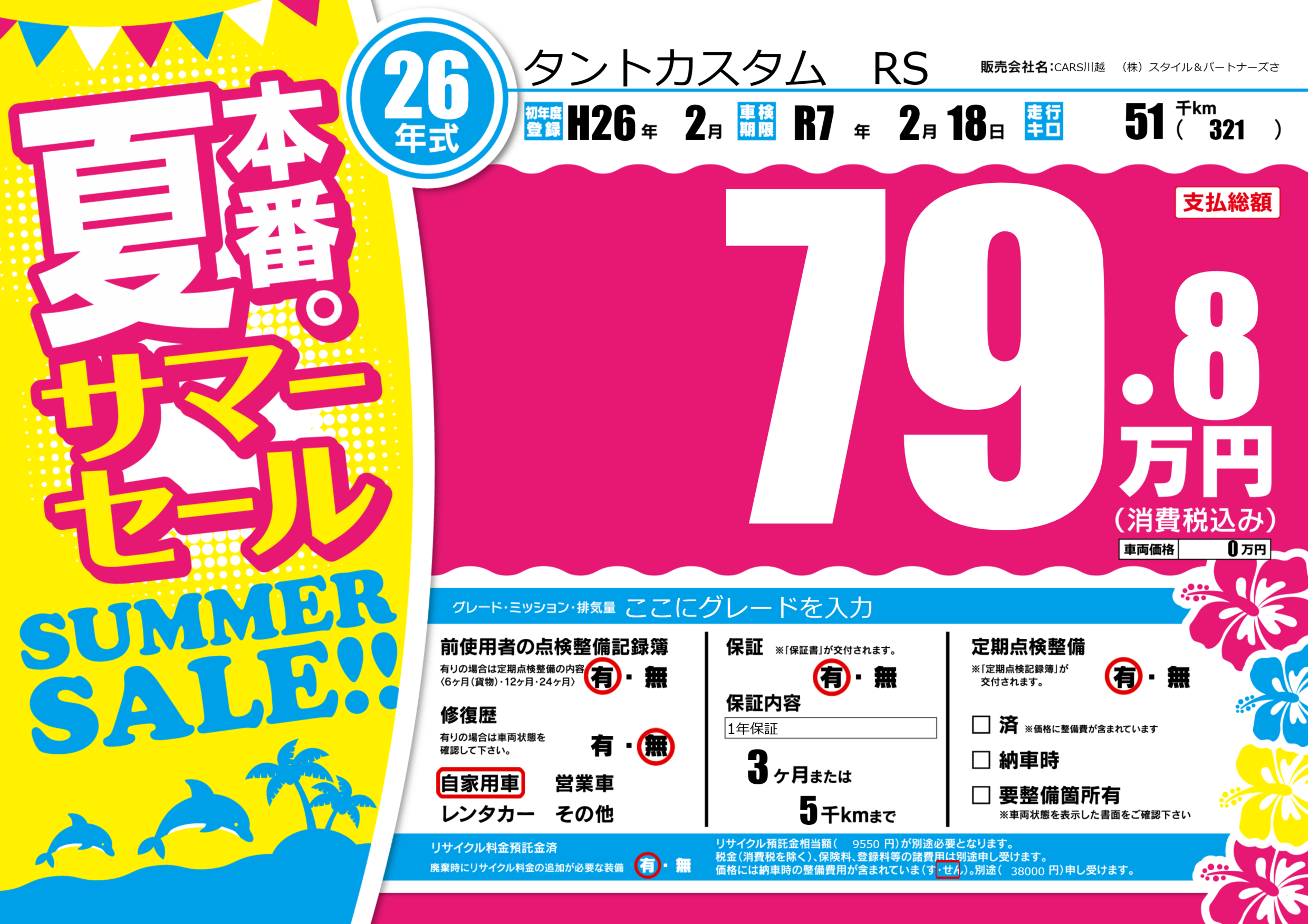 | 走行キロ | 5.1万km | 初年度登録 | H26年2月 |