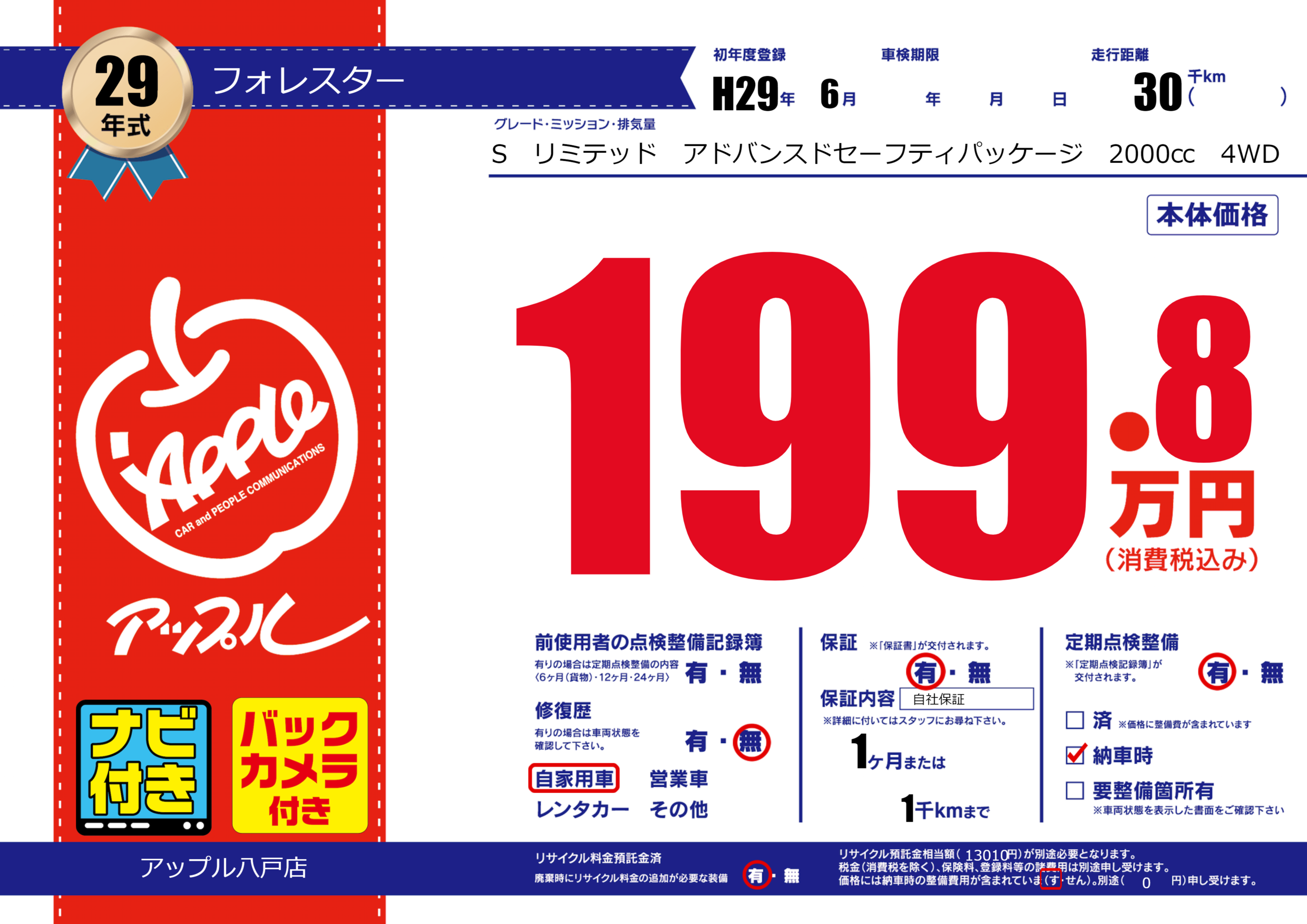 | 走行キロ | 3万km | 初年度登録 | H29年6月 |