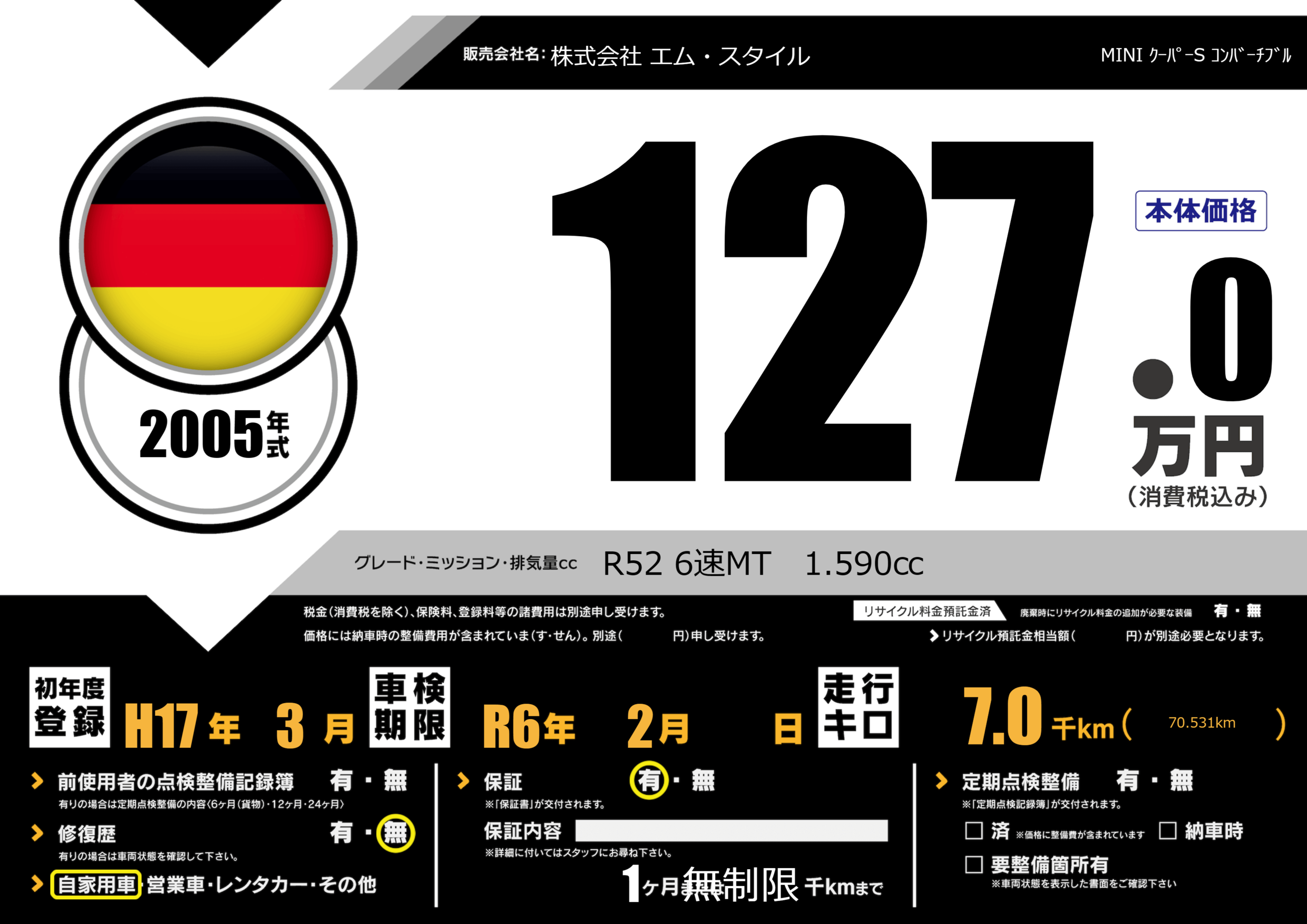 | 車名 | MINI クーパーS コンバーチブル | グレード ミッション 排気量 |