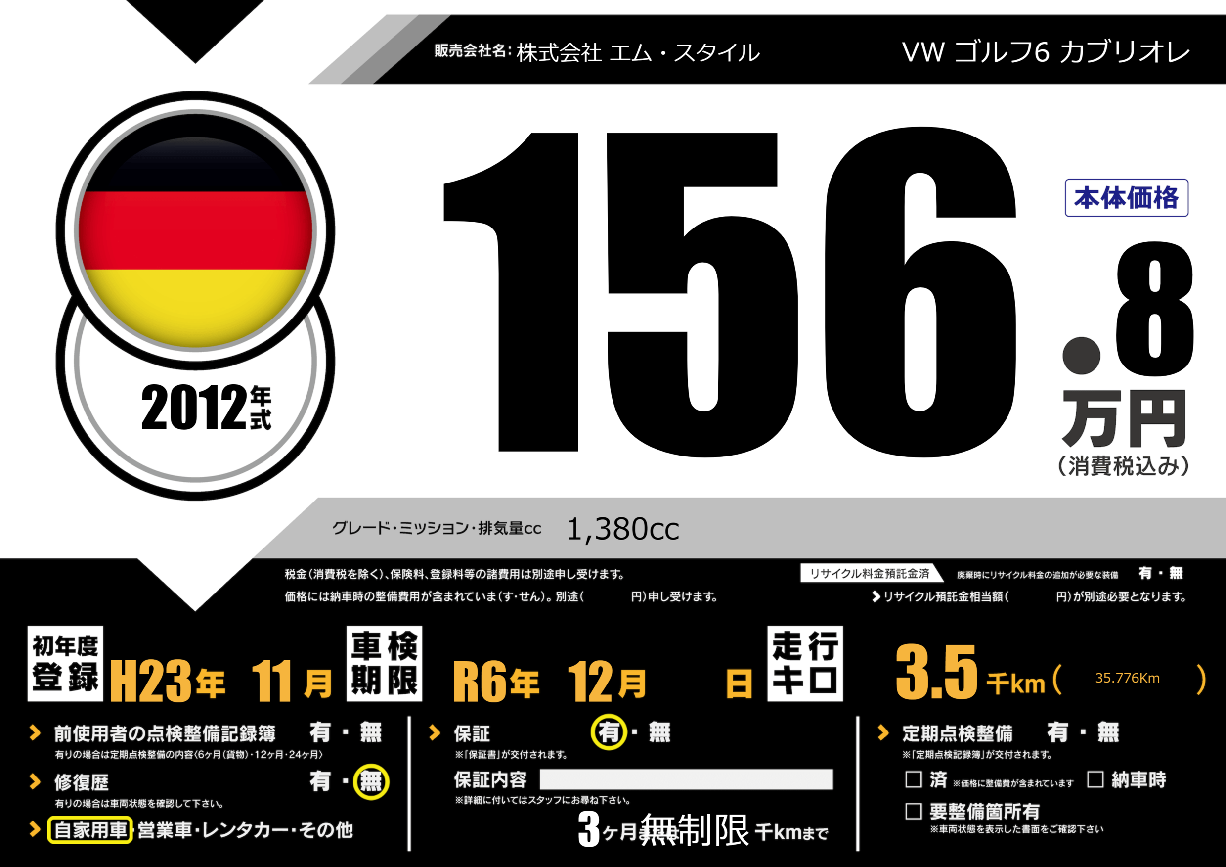 | 車名 | VW ゴルフ6 カブリオレ | グレード ミッション 排気量 |
