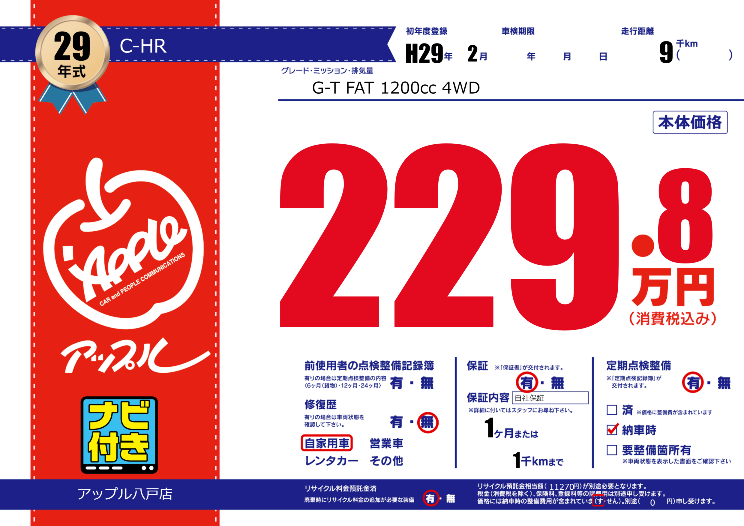 保証付き 保証内容( 自社保証) 1ヶ月または(1)千kmまで |