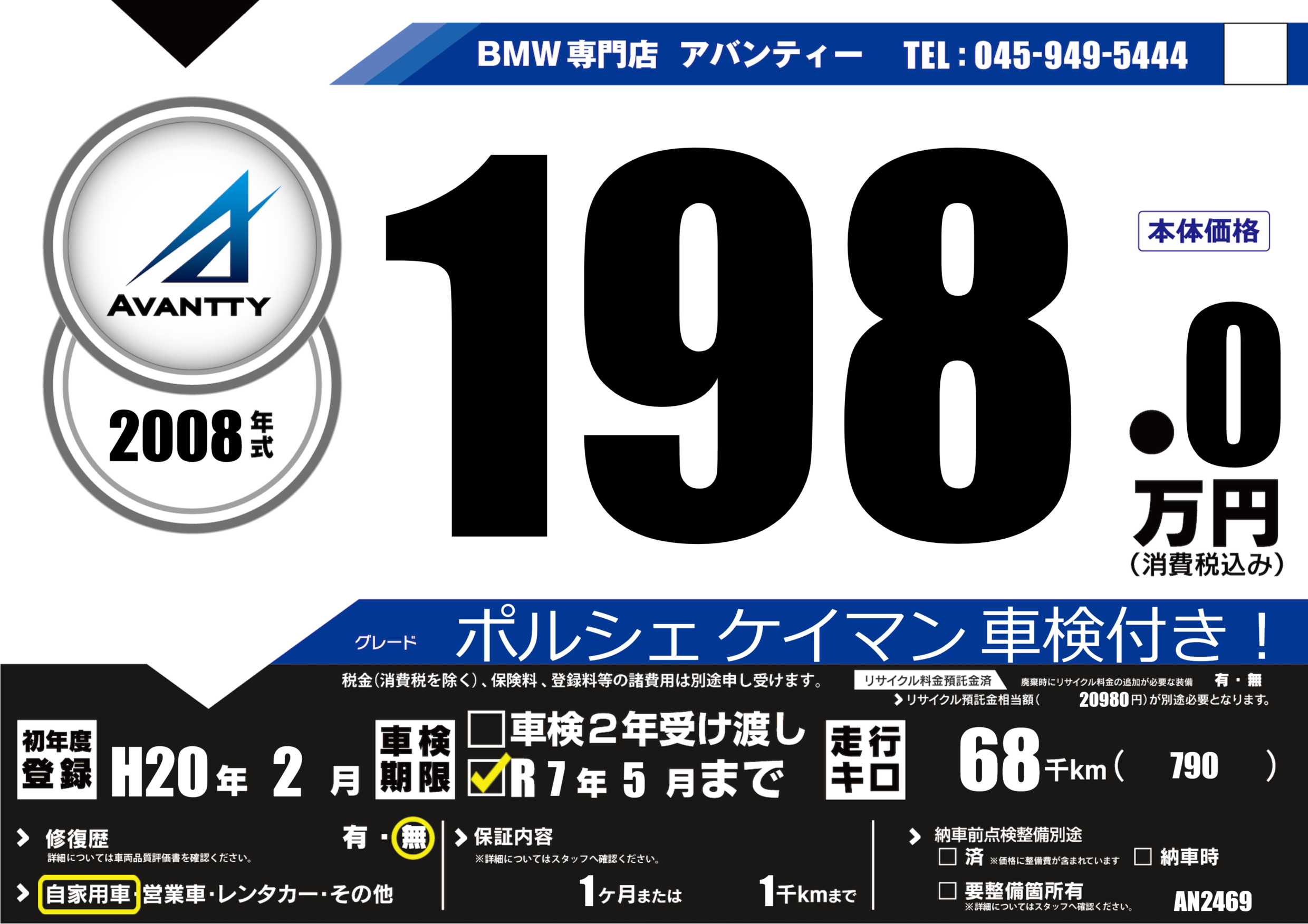 | 走行キロ | 6.8万km | 初年度登録 | H20年2月 |