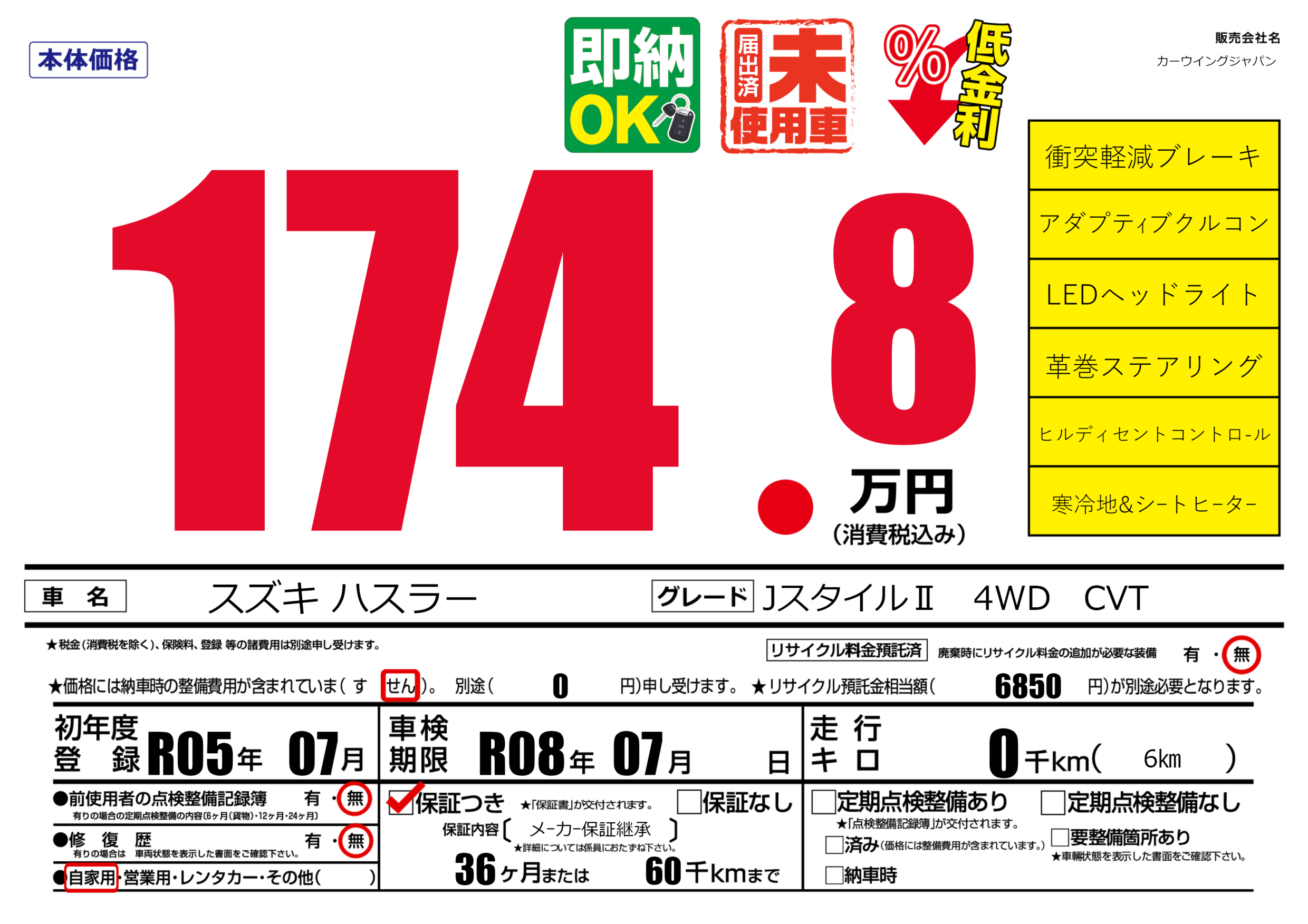 | 車名 | スズキ ハスラー | グレード ミッション 排気量 |