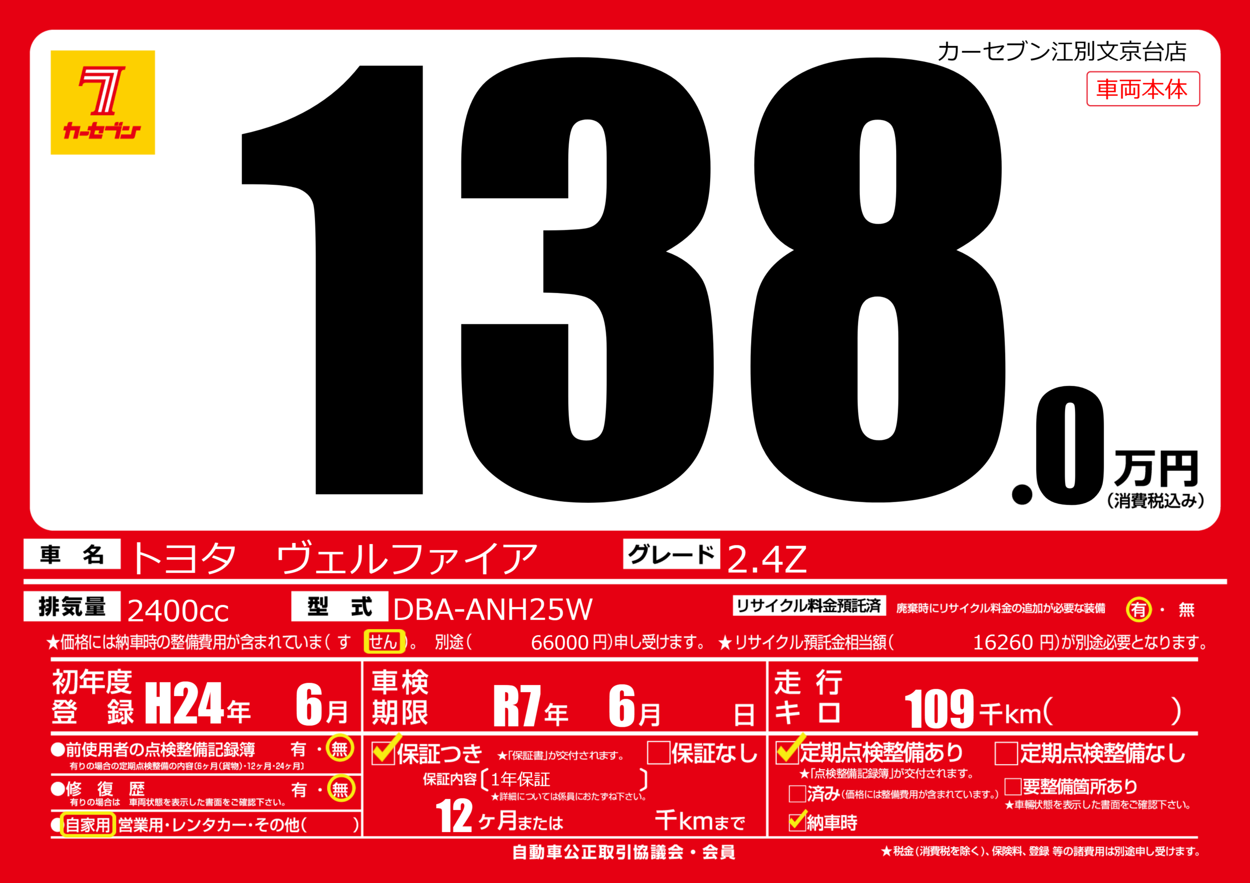 | 走行キロ | 10.9万km | 初年度登録 | H24年6月 |