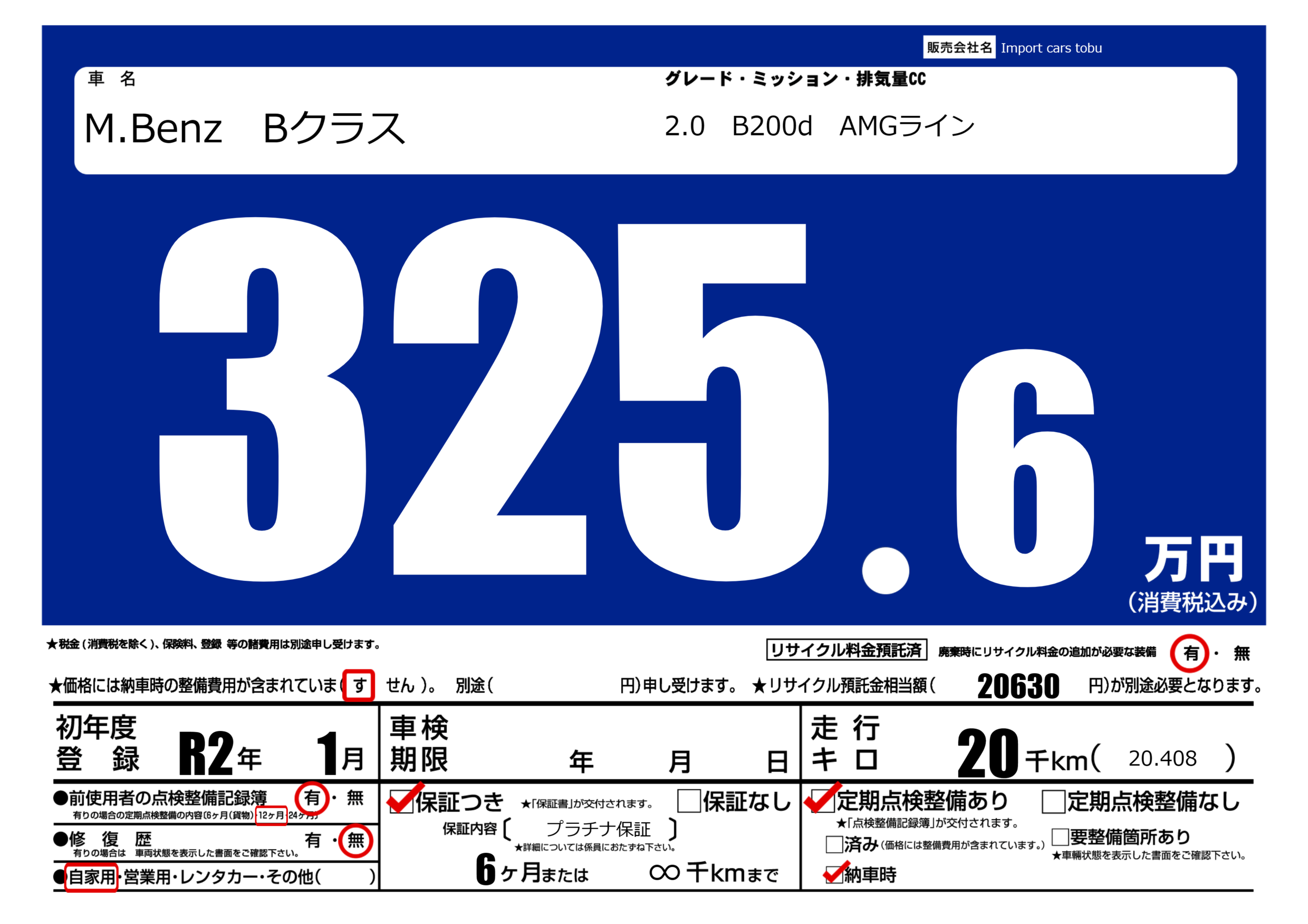 | 車名 | M.Benz Bクラス | グレード ミッション 排気量 |